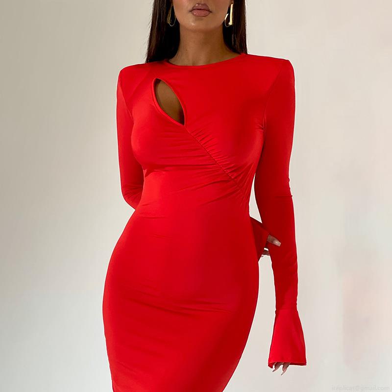 Sexy Round Neck Hollow Out Maxi Dress For Women Elegant Flare Sleeve Ruffled Hip Wrapping Bodycon Long Dresses Party Date Night Clubwear Satin Evening Gown