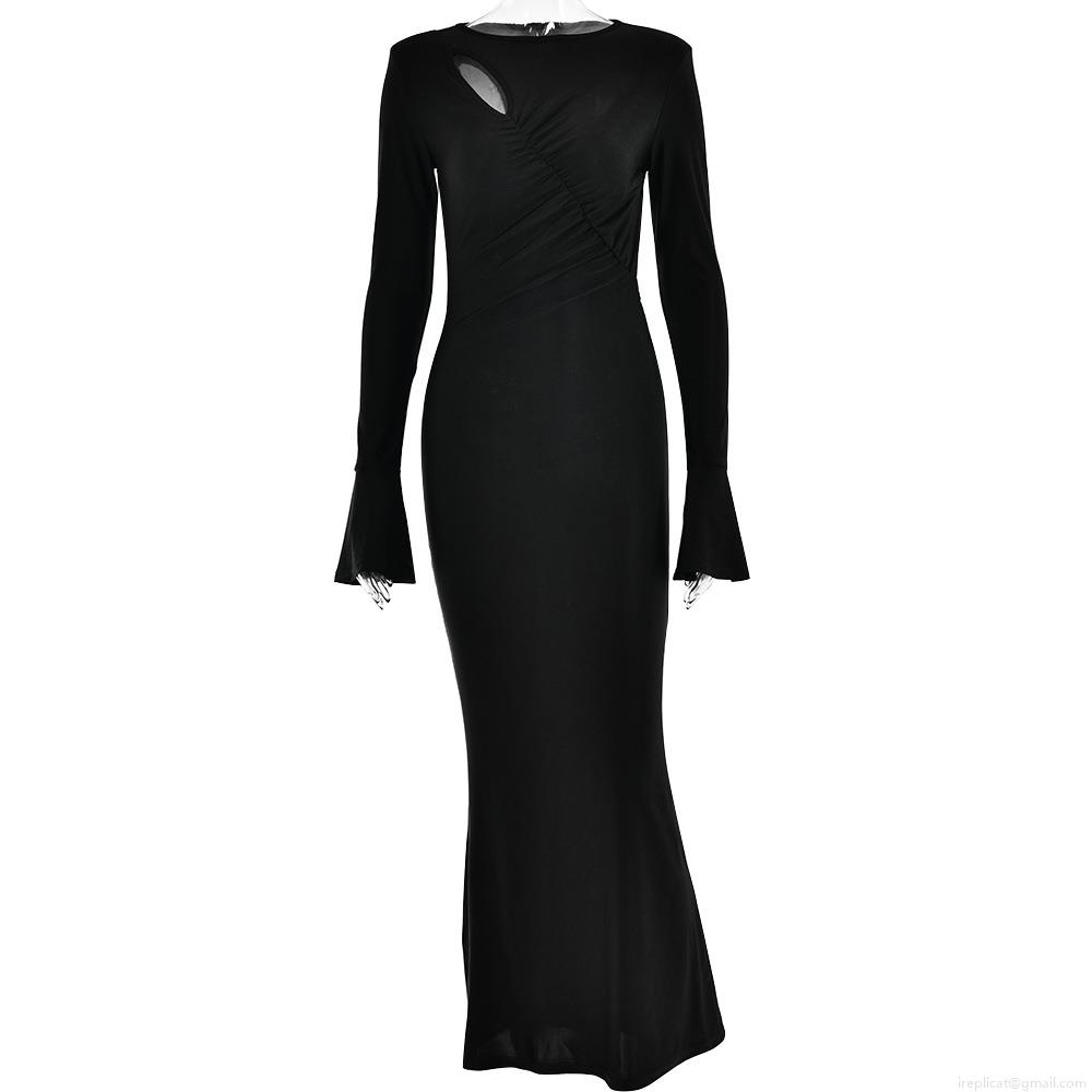 • Sexy Round Neck Hollow Out Maxi Dress For Women Elegant Flare Sleeve Ruffled Hip Wrapping Bodycon Long Dresses Party Date Night Clubwear Satin Evening Gown