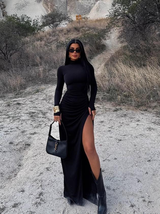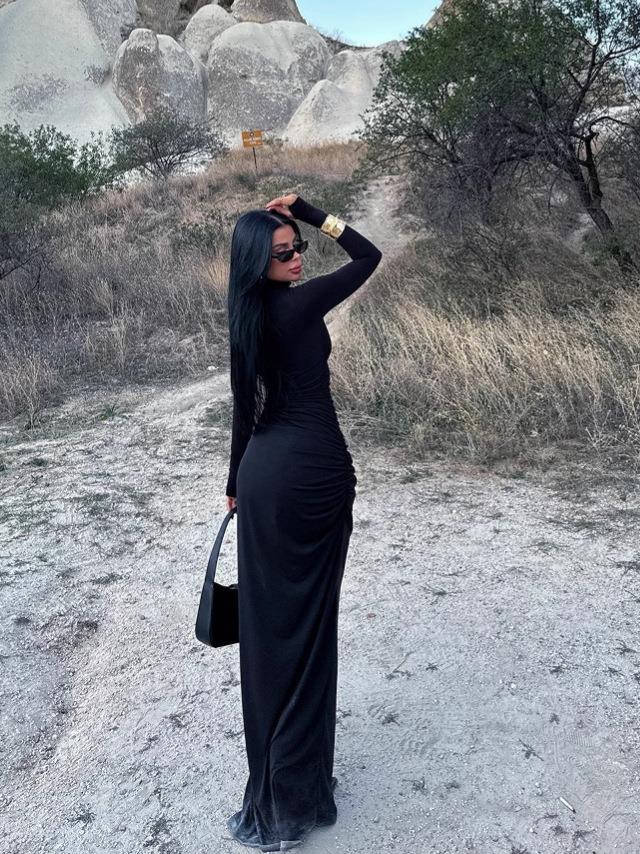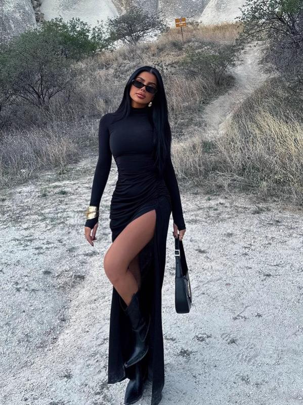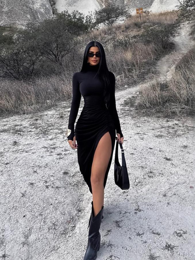 • Sexy Ruched Maxi Dress Milk Silk High Neck Long Sleeve Side Split Bodycon Dress For Women Autumn Winter Party Club Solid Color Slim Fit Fashion