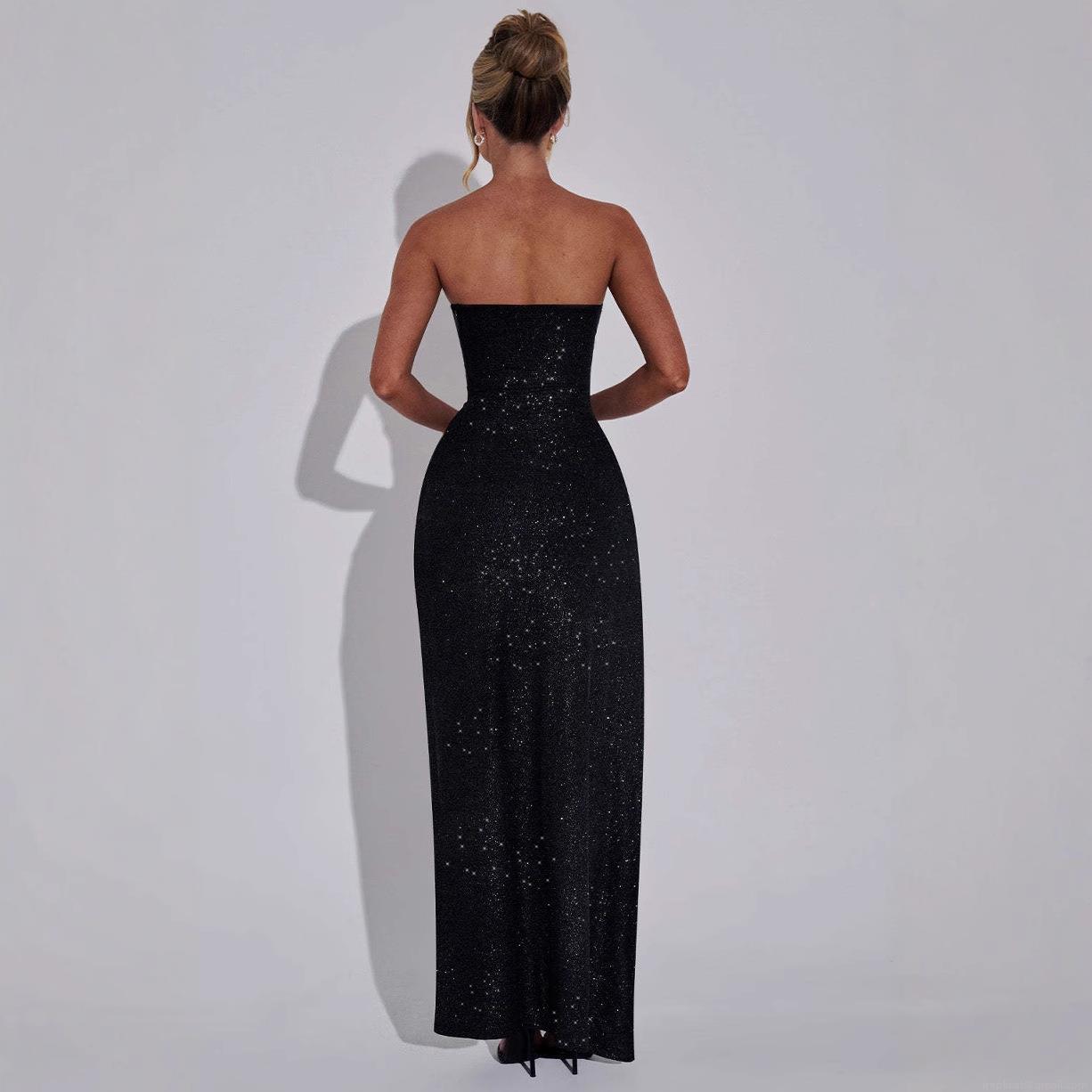 • Sexy Sequin Maxi Dress Strapless High Slit Slim Fit Polyester Sparkly Evening Gown For Women Party Banquet Socialite Style Bodycon Dress