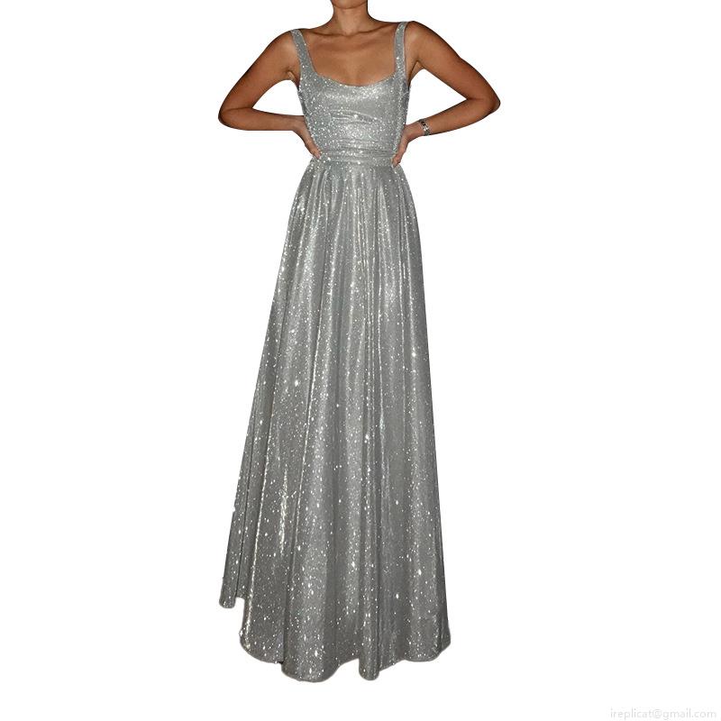 Sexy Sequin Maxi Dress Women Square Neck Sleeveless Glitter Evening Party Gown Elegant Formal Prom Dress Polyester Spandex Ladies Luxury Long Dress