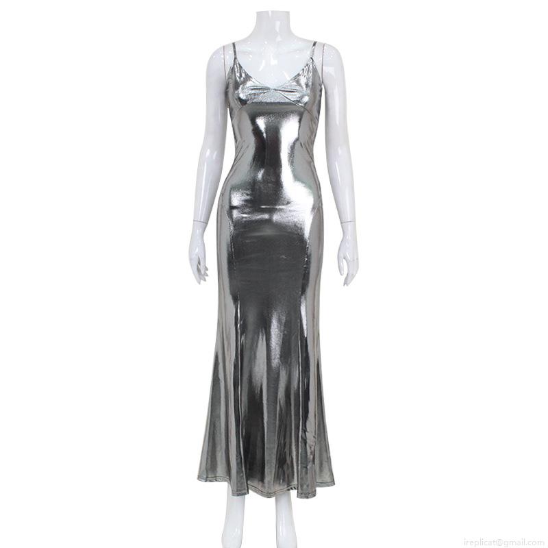 Sexy Silver Liquid Metal Shiny Maxi Dress Women Backless V Neck Bodycon Mermaid Evening Gown Formal Party Sleeveless Long Dress Fish Tail Clubwear