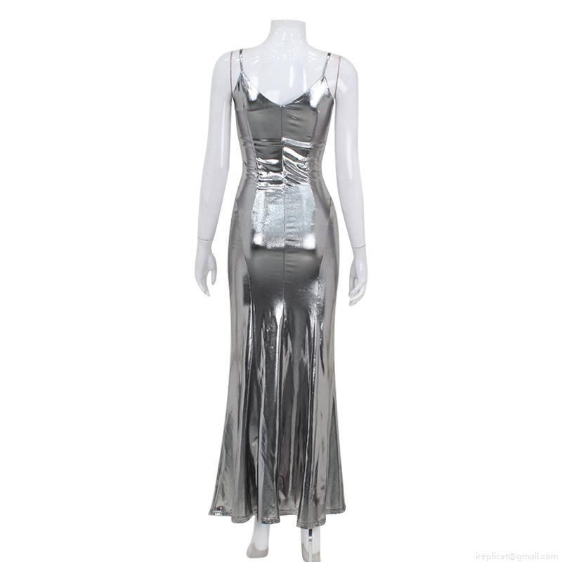 • Sexy Silver Liquid Metal Shiny Maxi Dress Women Backless V Neck Bodycon Mermaid Evening Gown Formal Party Sleeveless Long Dress Fish Tail Clubwear