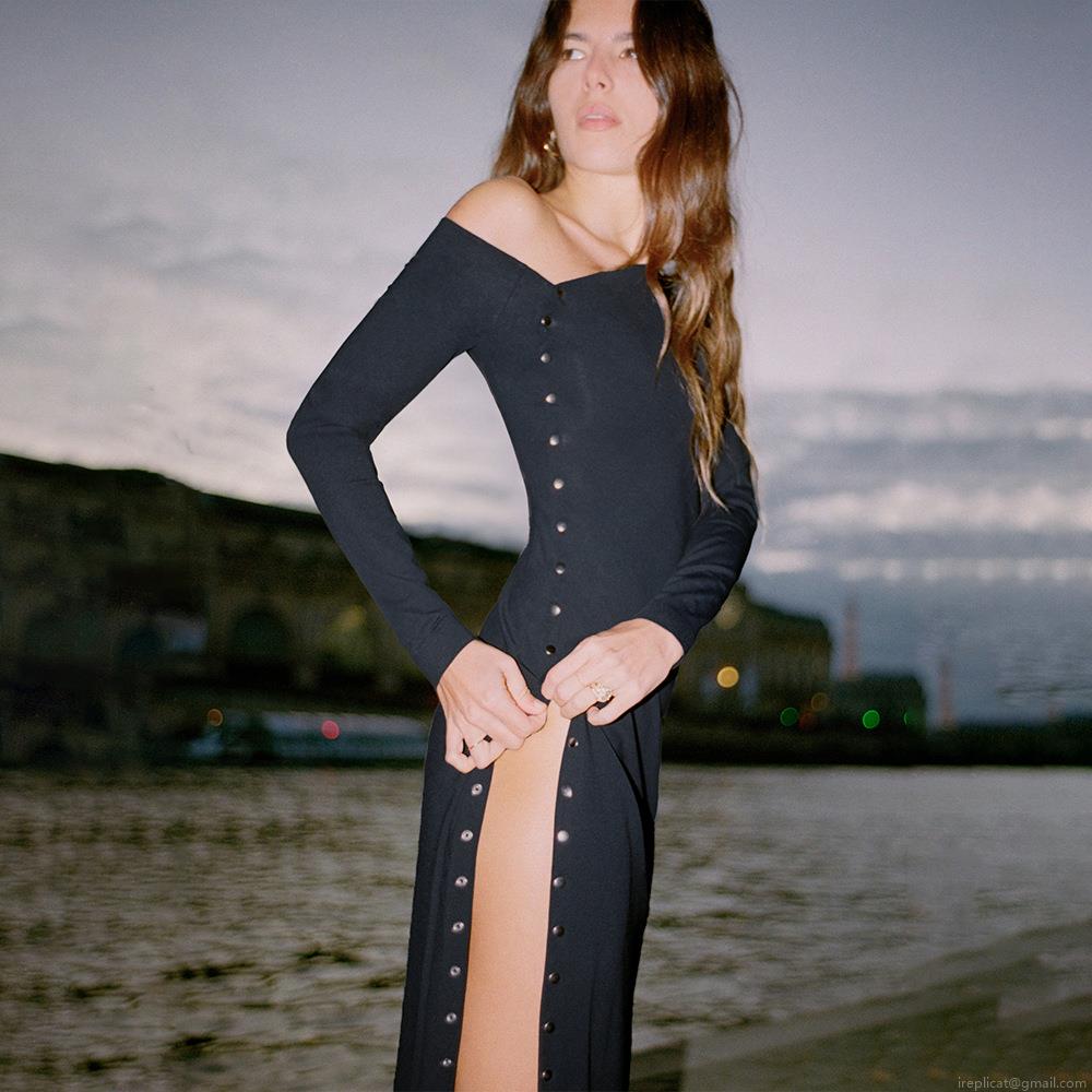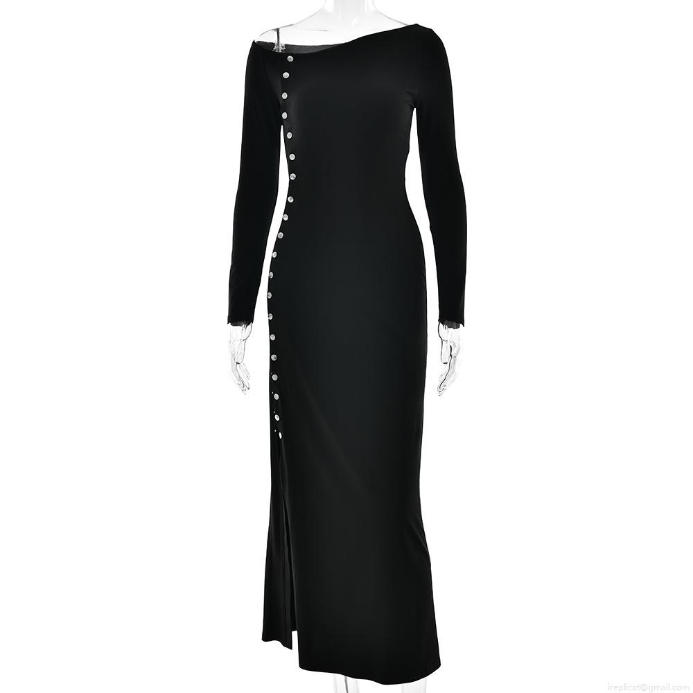 • Sexy Slanted One Shoulder High Slit Maxi Dress Women Long Sleeve Single Breasted Milk Silk Floral Polka Dot Bodycon Evening Party Dress