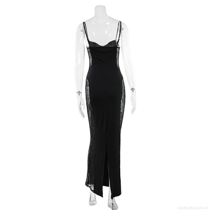 Sexy Spaghetti Strap Backless Maxi Dress For Women Lace Patchwork Bodycon Long Dress Side Hollow Out Slit Evening Party Clubwear Night Out Dress