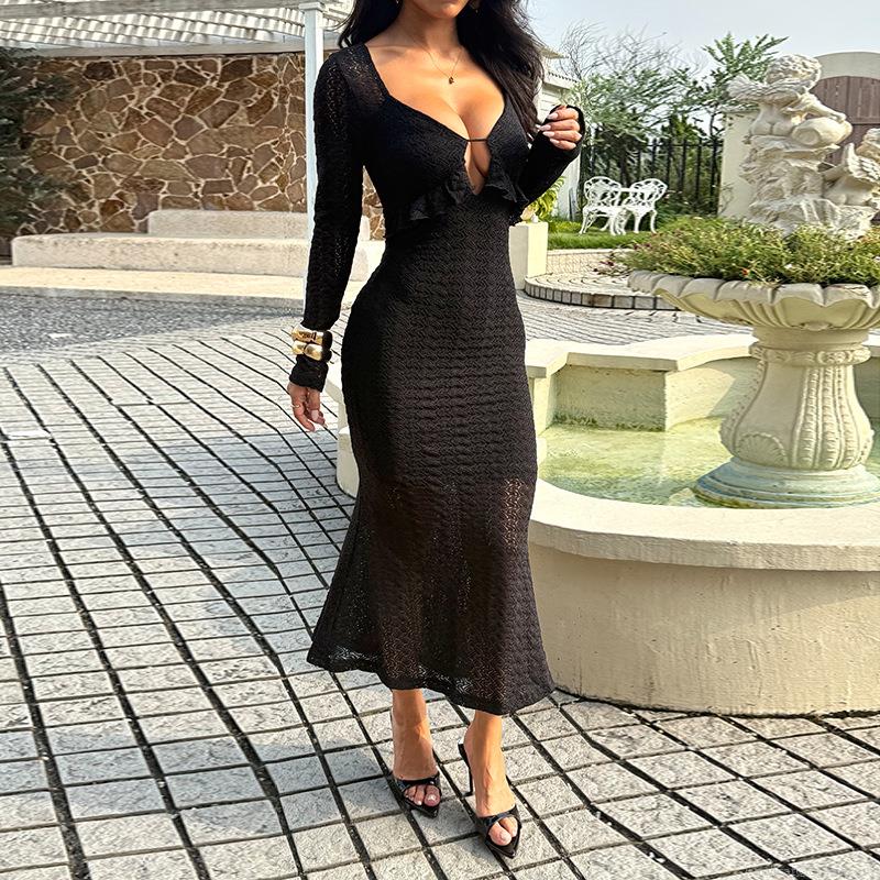 Sexy V-Neck Long Sleeve Maxi Dress For Women Hollow Textured Bodycon Fishtail Evening Gown Elegant Night Out Party Clubwear