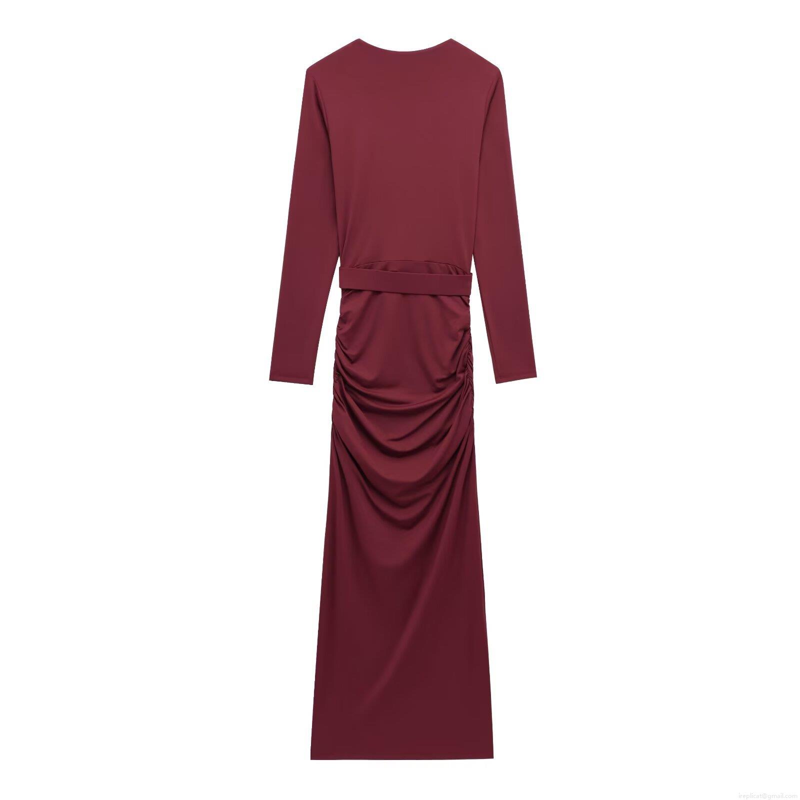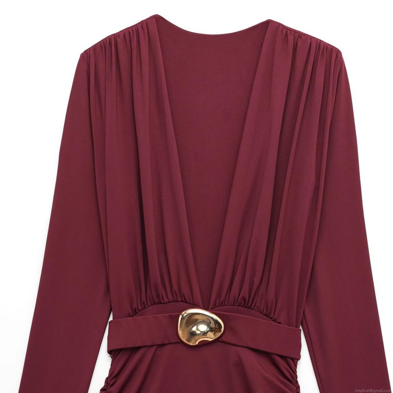 • Sexy V-Neck Long Sleeve Maxi Dress With Pleated Waist Metal Buckle Elegant Solid Color Polyester Spandex Bodycon Slim Fit Gown For Women Party Evening