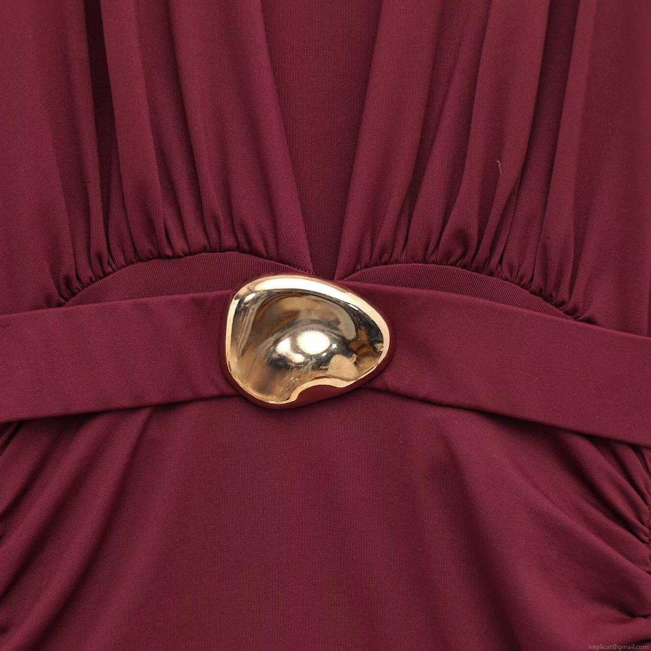 Solid Color, Pleats, Belt, Metal Buckle, Deep V