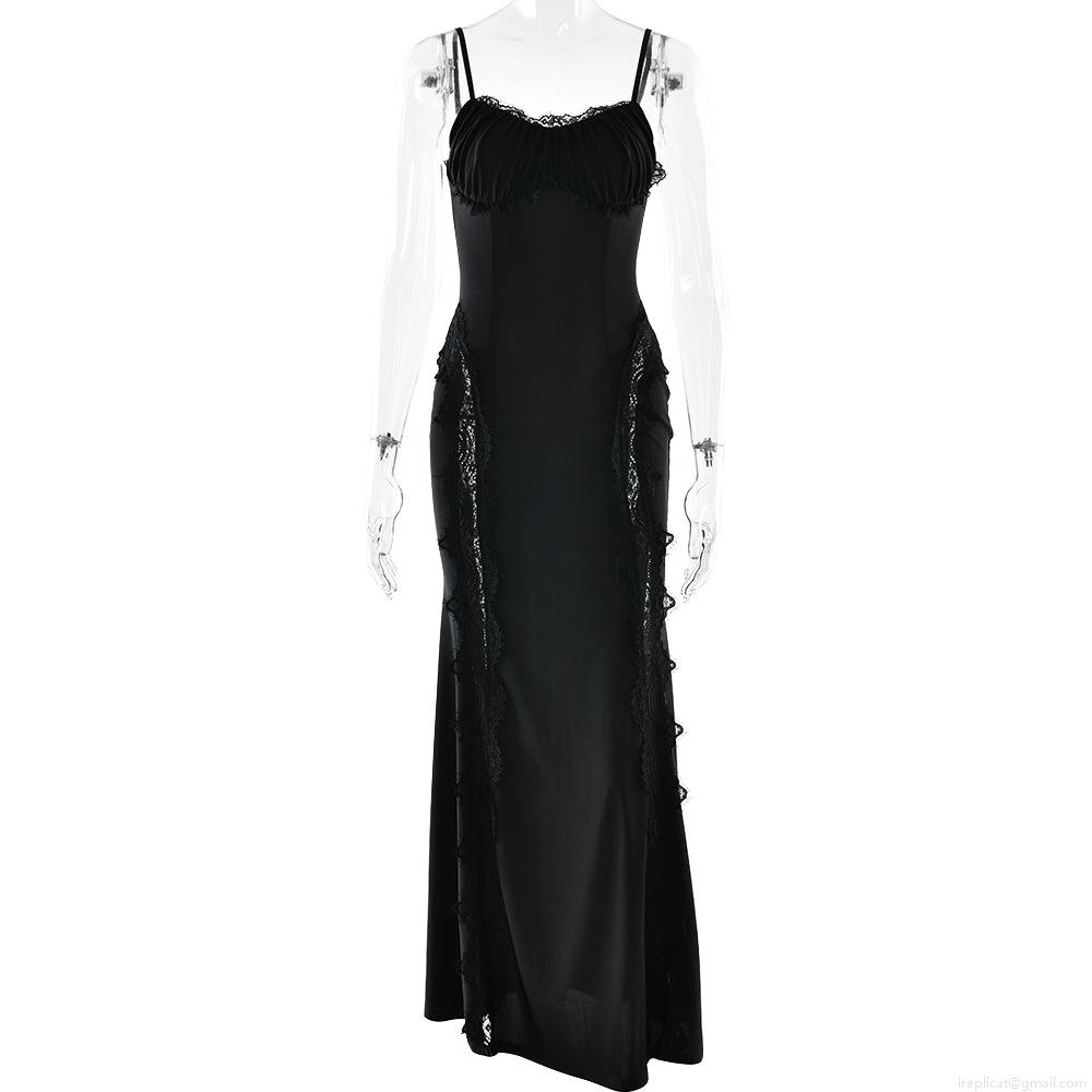 • Sexy V-Neck Sleeveless Satin Lace Patchwork Bodycon Maxi Dress For Women Party Club Evening Chic Hollow Out Long Gown