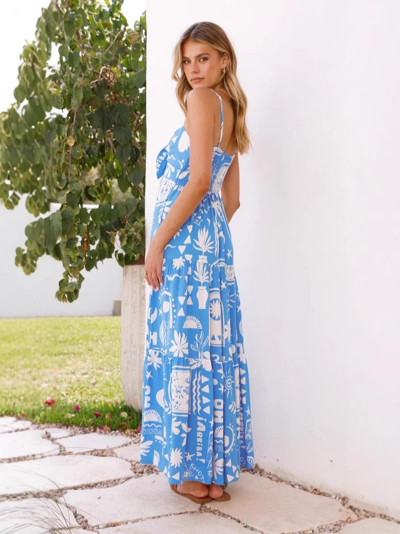 • Sexy V-Neck Spaghetti Strap Floral Print Polyester Spandex Maxi Dress For Women Summer Beach Vacation High Split Backless Tiered Long Dress