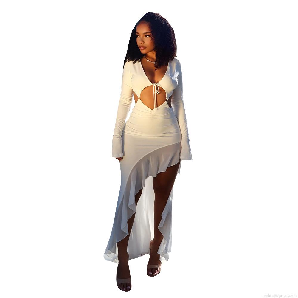 • Sexy White Cut Out Long Sleeve Maxi Dress Women Streetwear Deep V Neck Drawstring Irregular Ruffle Mermaid Hem Party Club Dress