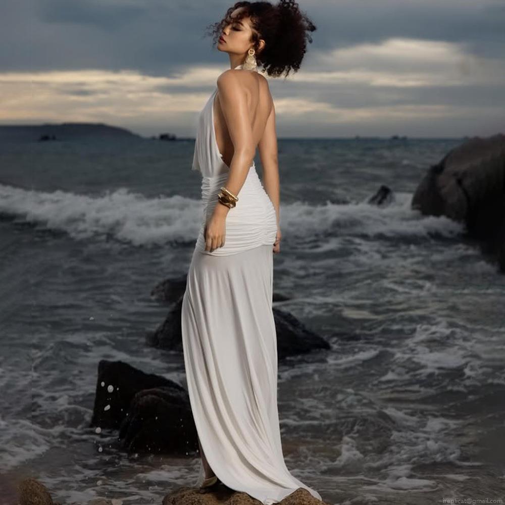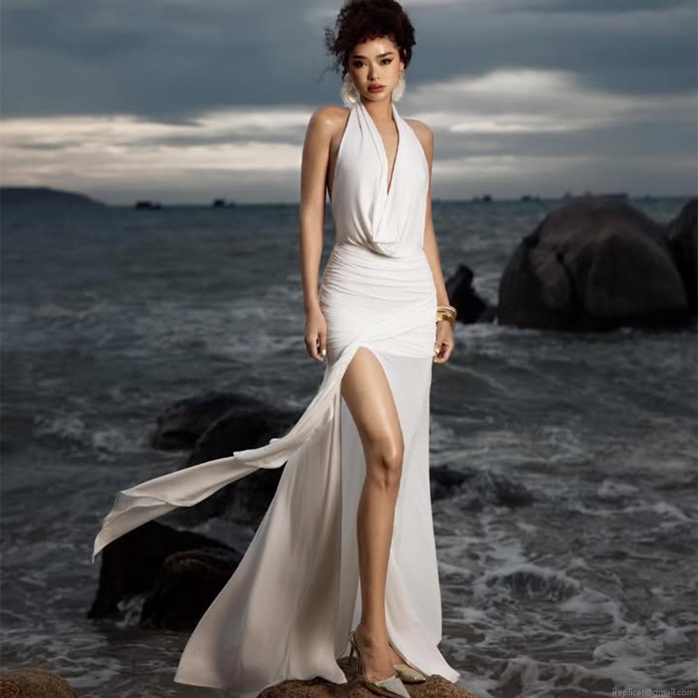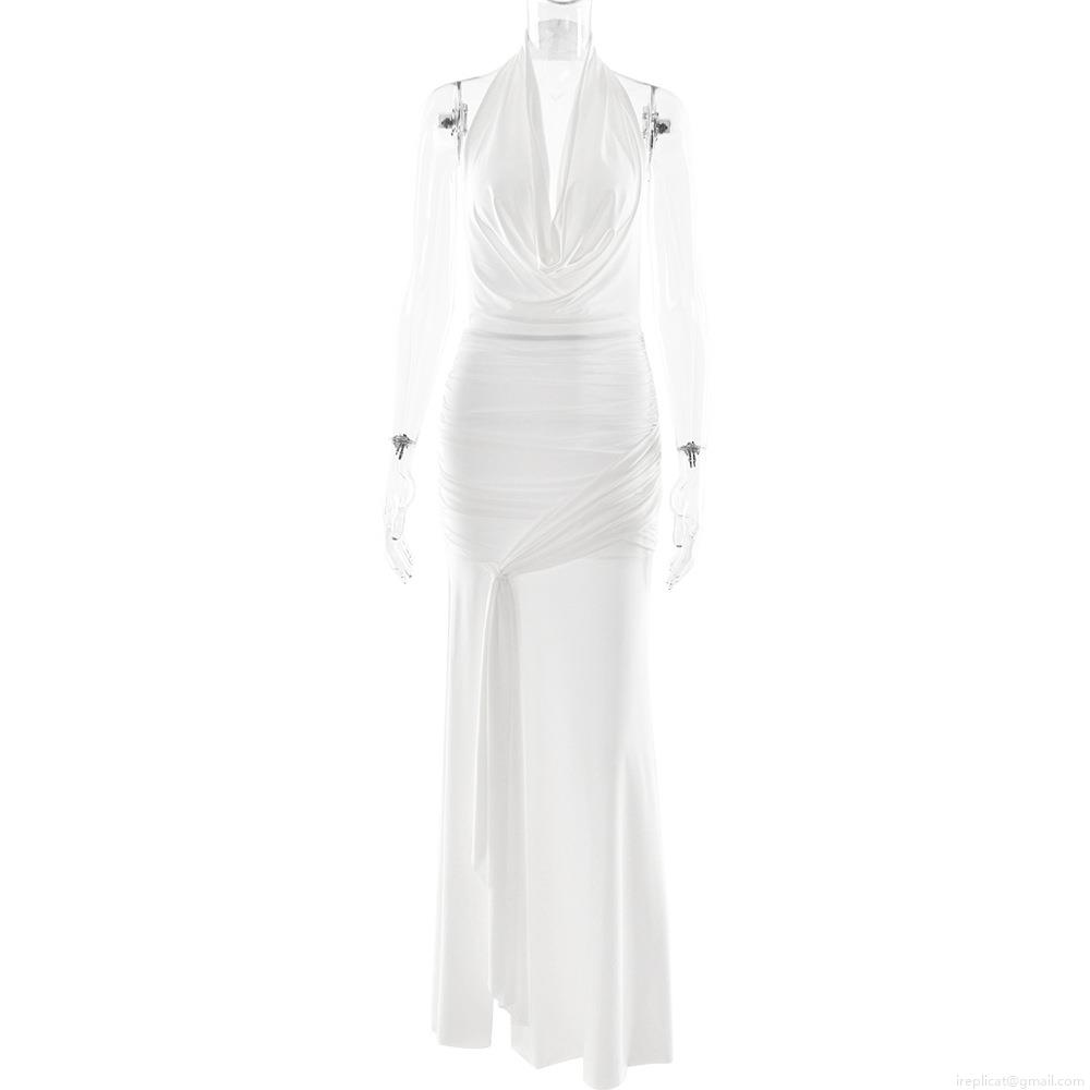 • Sexy White Halter Neck Backless Ruched Milk Silk Maxi Dress For Women Cowl Neck High Slit Elegant Evening Party Wedding Guest Long Dress