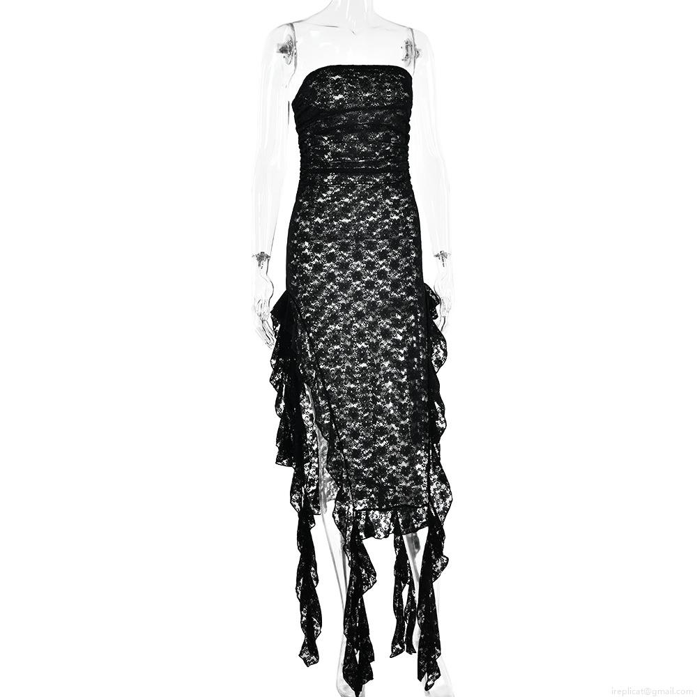 • Sexy Women Black Lace Patchwork Maxi Dress Strapless See-Through High Slit Ruffle Hem Long Gown For Summer Party Club Beach