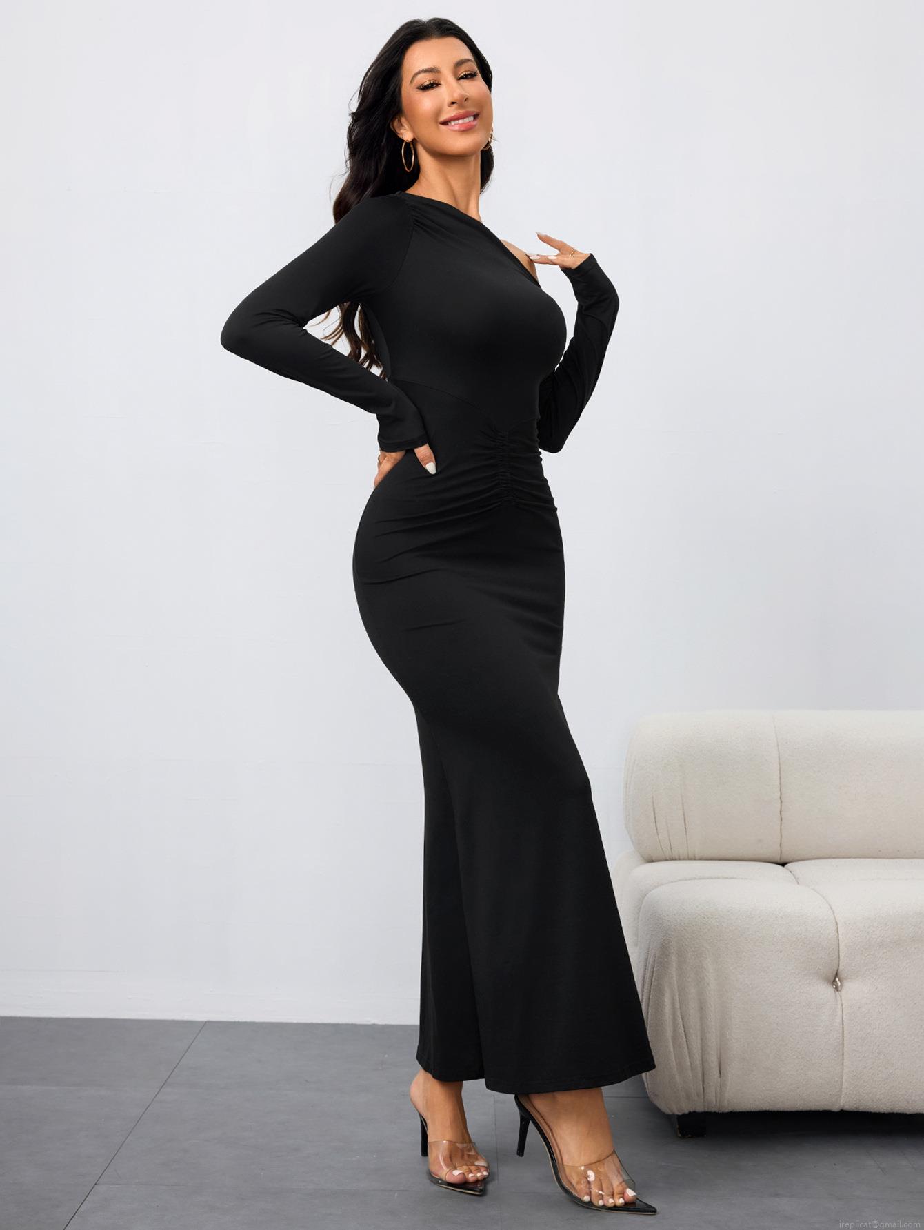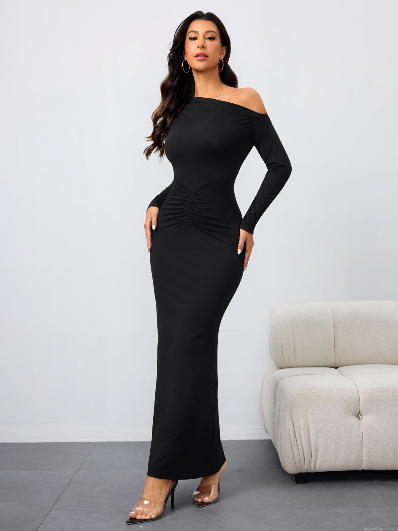 • Sexy Women Black Off-shoulder Diagonal Collar Long Sleeve Maxi Dress Ruched Waist Slim Fit Elegant Evening Party Cocktail Dress High Quality Polyester Spandex Blend