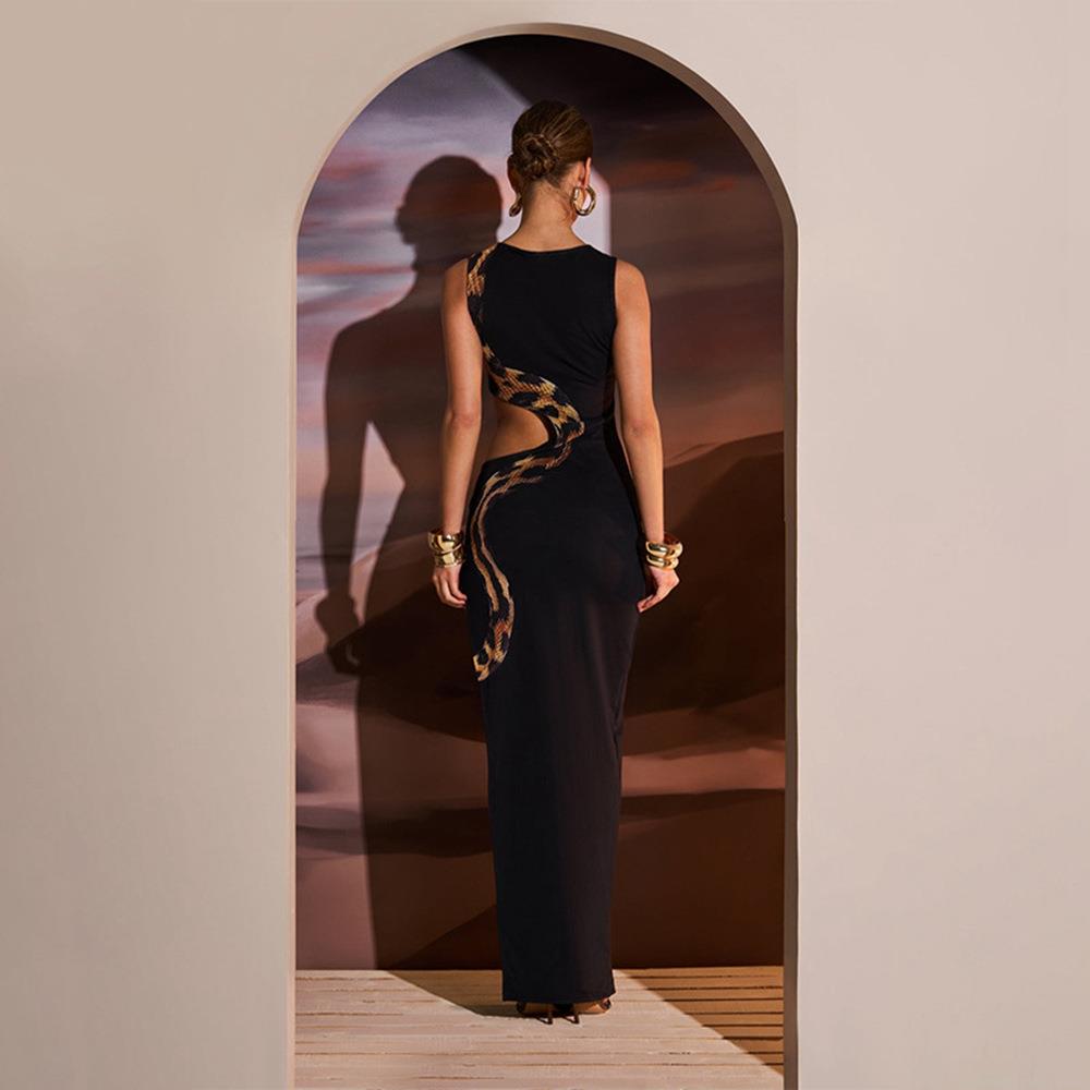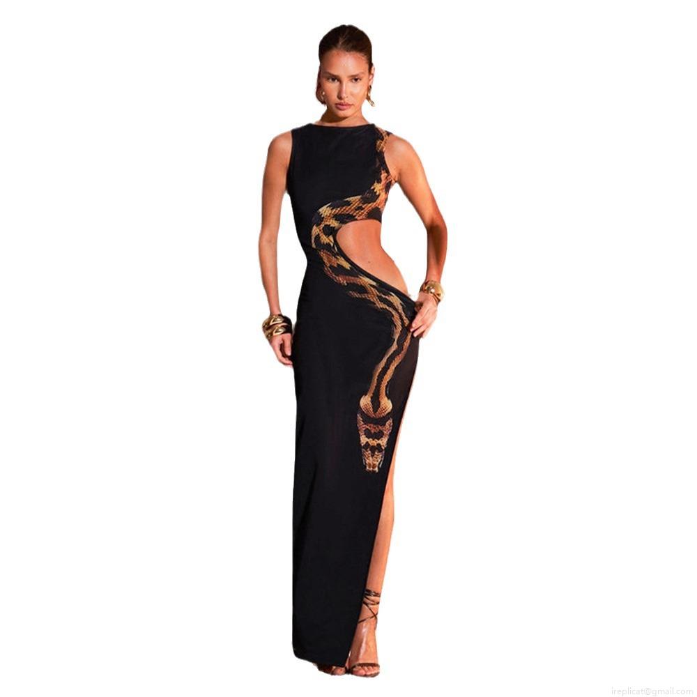 • Sexy Women Sleeveless Cut-out Snake Print Maxi Dress Slim Fit Side High Split Long Bodycon Dress For Party Evening Gown Vacation Summer Streetwear