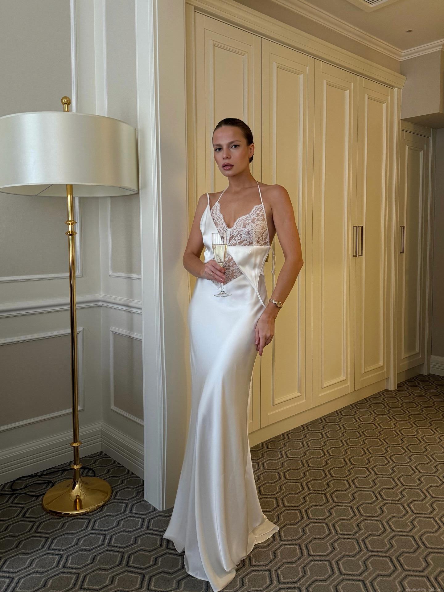 • Sexy Women's Backless Satin And Lace Stitching Maxi Dress V-Neck Slim Fit Solid Color Sling Dress For Party Banquet Evening Dating