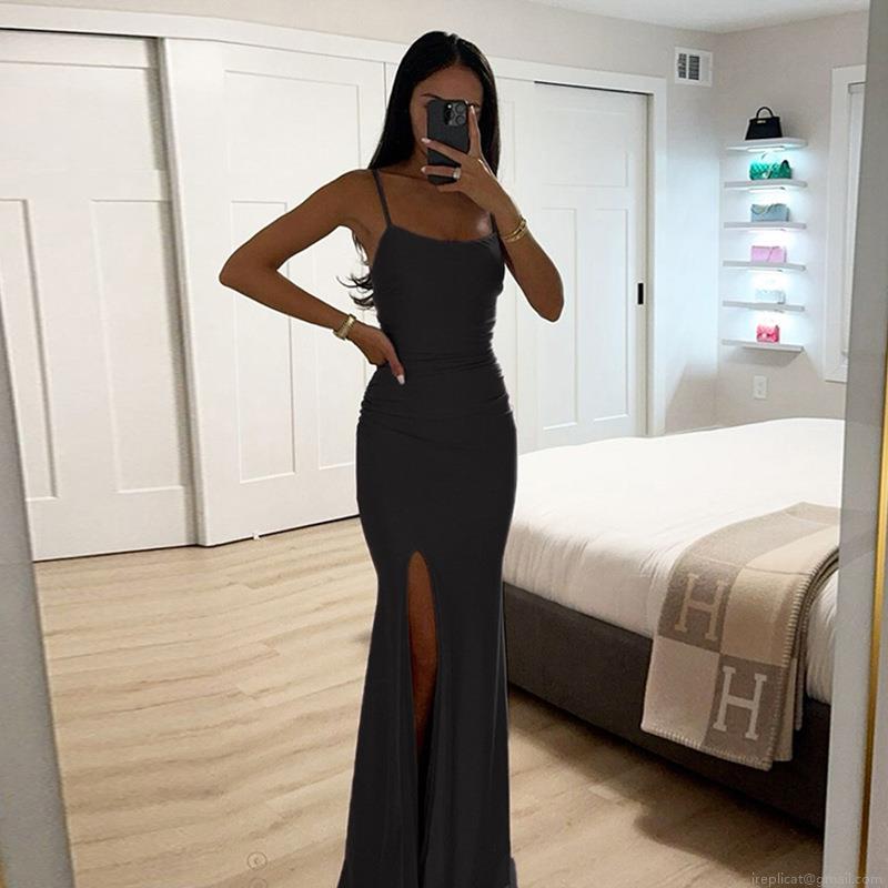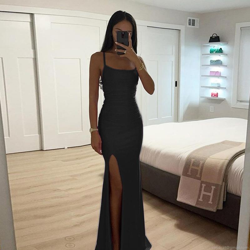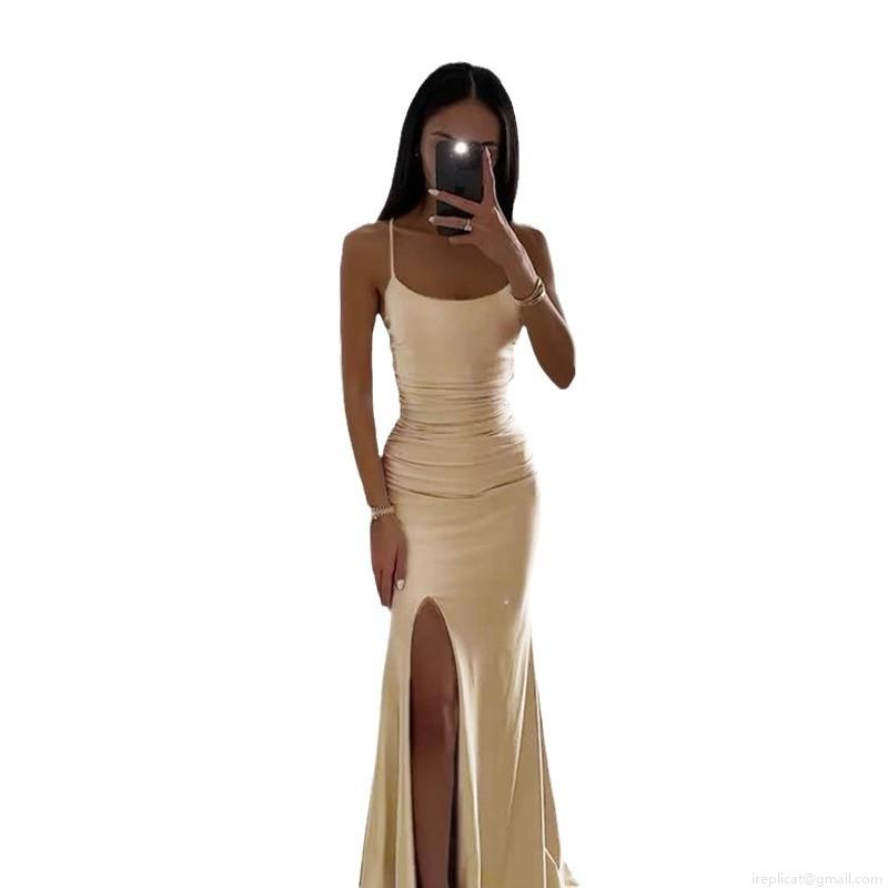 • Sexy Women's Champagne Satin Maxi Dress Elegant Ruched Bodycon Fishtail Evening Gown High Slit Sleeveless Camisole Party Dress For Banquet Wedding