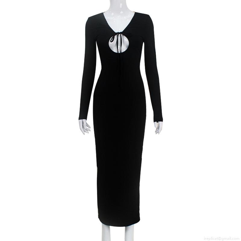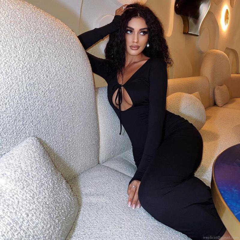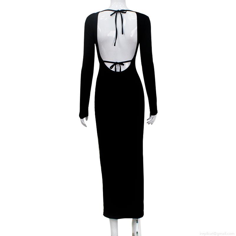 • Sexy Women's Long Sleeve Hollow Out Backless Maxi Dress Lace-up Bodycon Clubwear Polyester Spandex Evening Party Dress