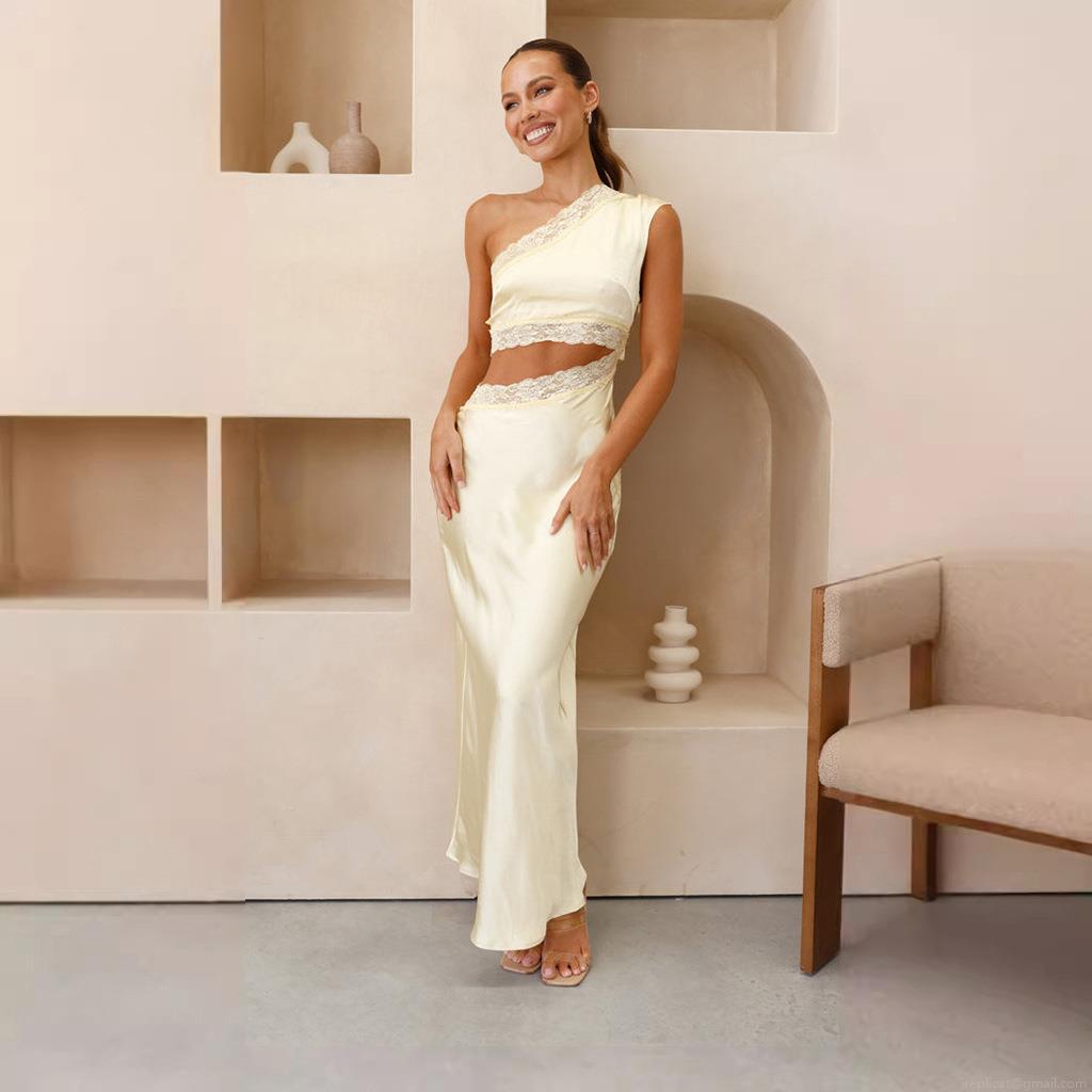 • Sexy Women's One Shoulder Hollow Out Lace Trim Satin Maxi Dress Floral Print Sleeveless Backless Floor Length Vacation Party Evening Dress