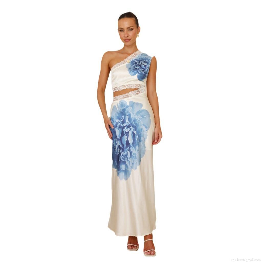 Sexy Women's One Shoulder Hollow Out Lace Trim Satin Maxi Dress Floral Print Sleeveless Backless Floor Length Vacation Party Evening Dress