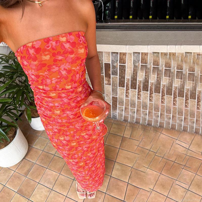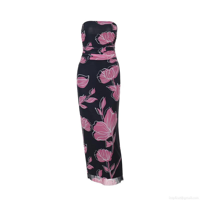 • Sexy Women's Strapless Ruched Maxi Dress Polyester Spandex Mesh Floral Print Slim Fit Bodycon Long Dress For Summer Party Vacation