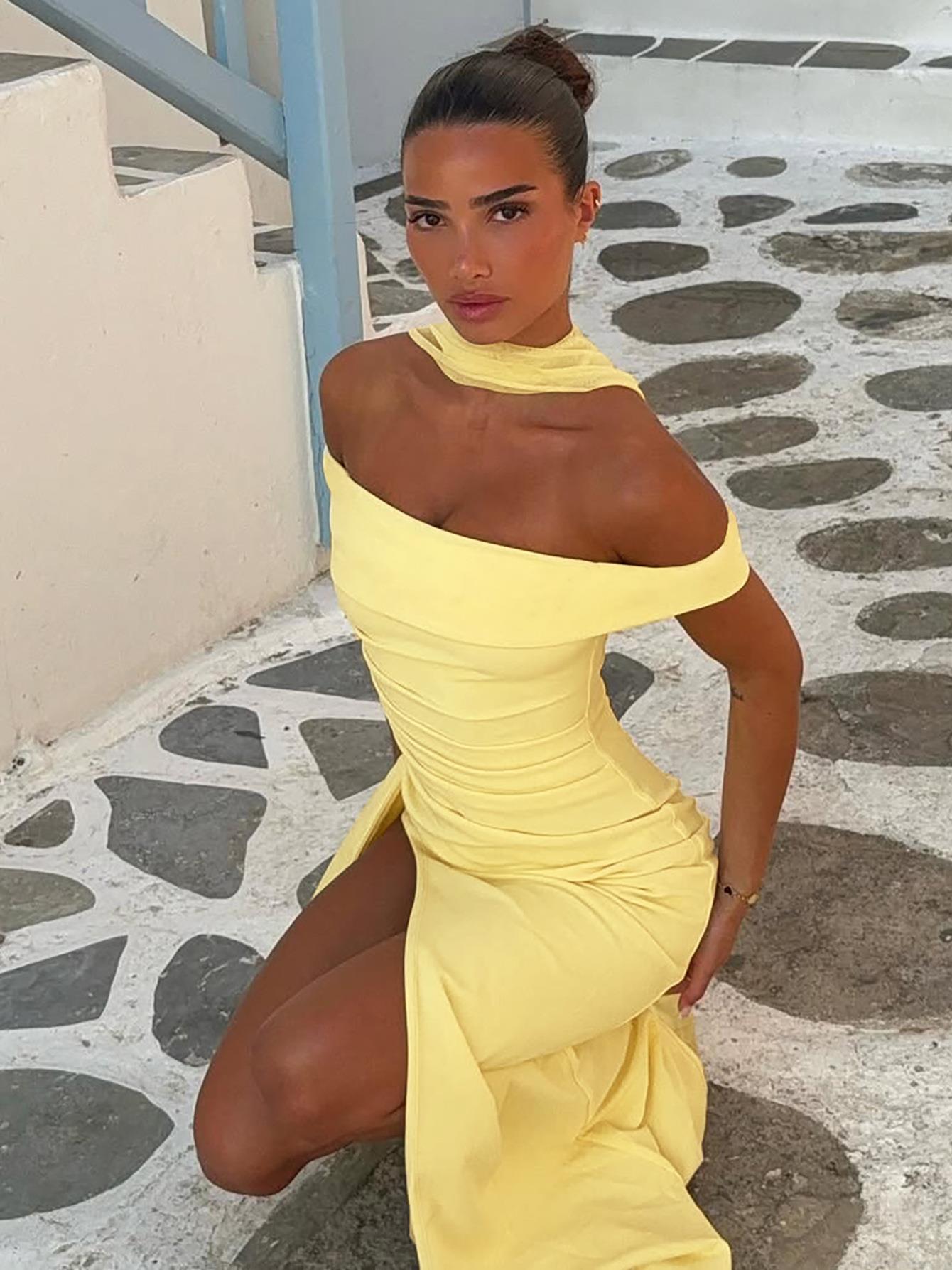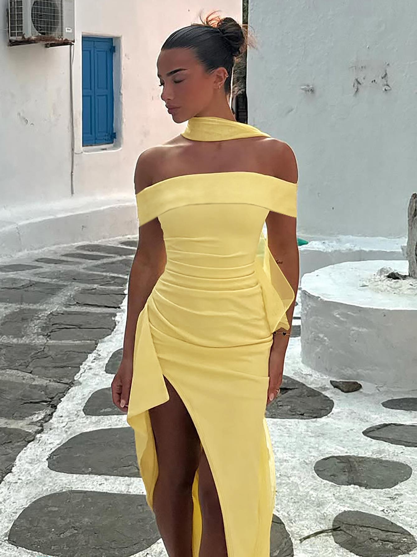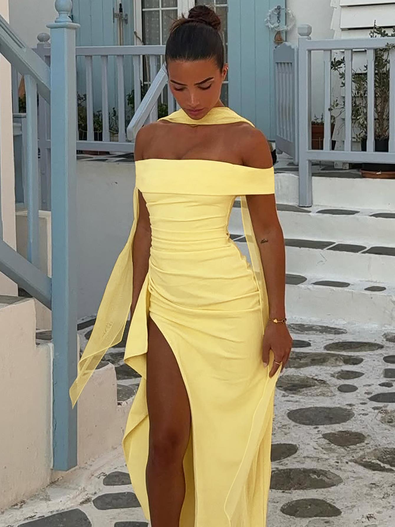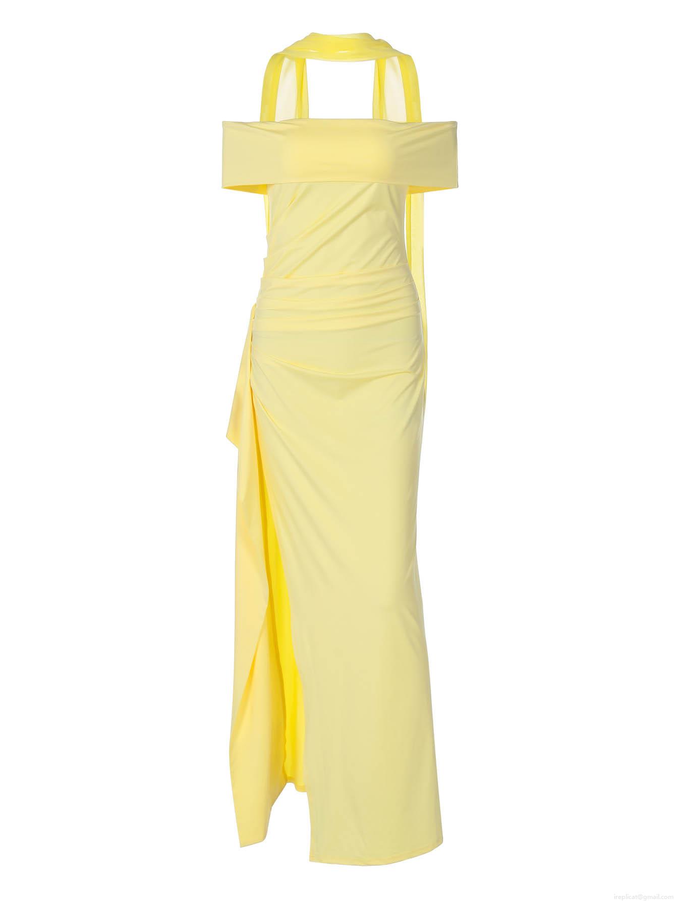 • Summer Sexy Yellow Strapless Off-Shoulder Maxi Dress Spliced Streamer Slim Fit High Slit Polyester Spandex Evening Gown Vacation Party Wear For Women