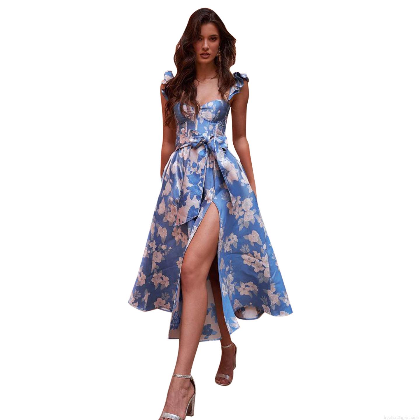 • Summer Women Halter Backless High Slit Maxi Dress Floral Print Satin Polyester Sexy Vacation Streetwear Party Bow Tie Ruffle Strap Dress