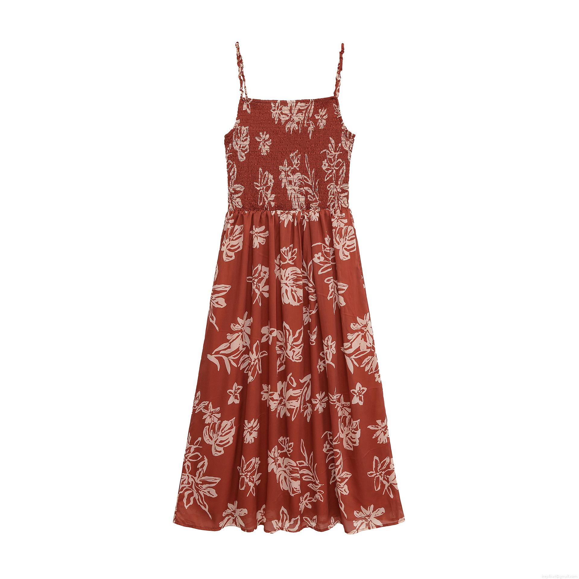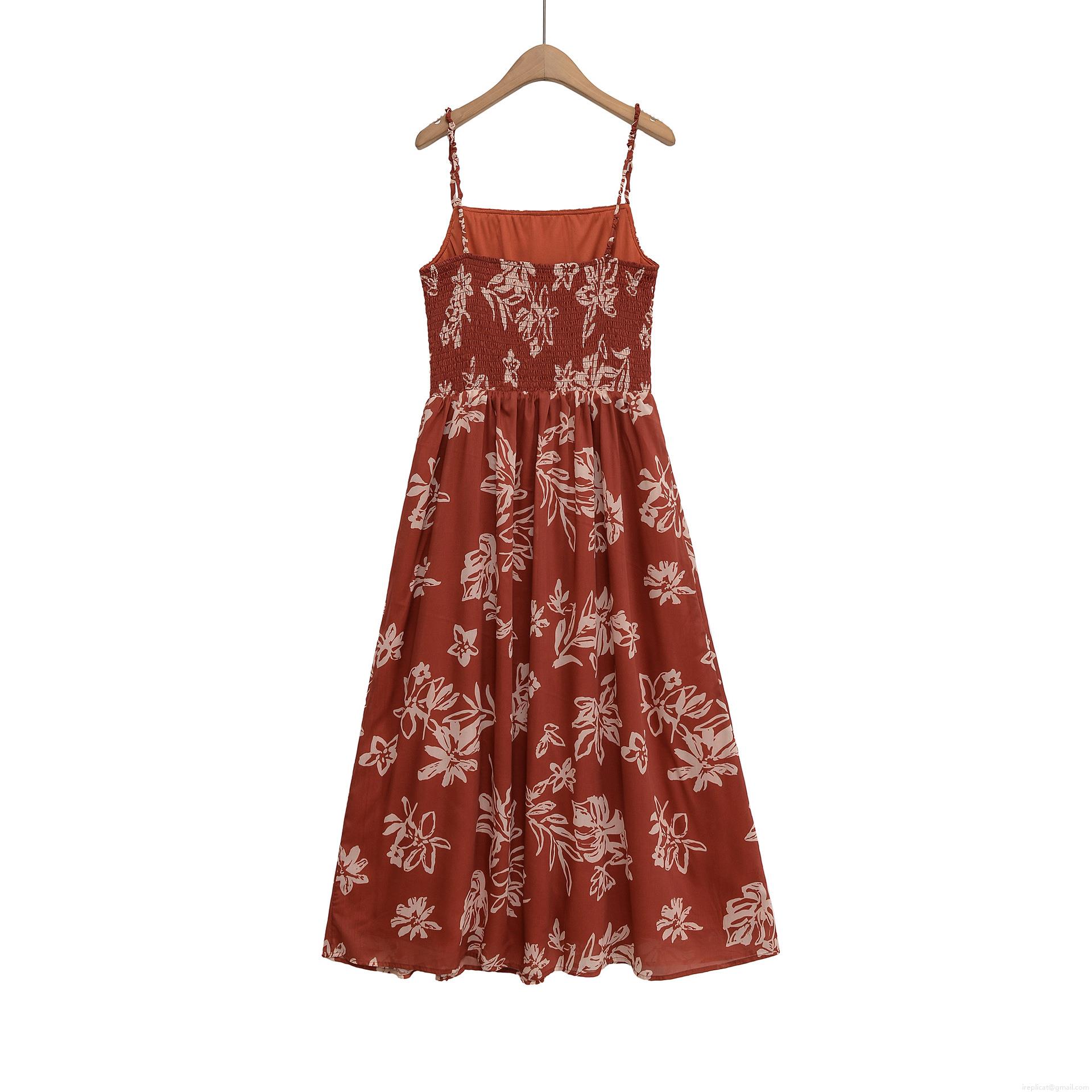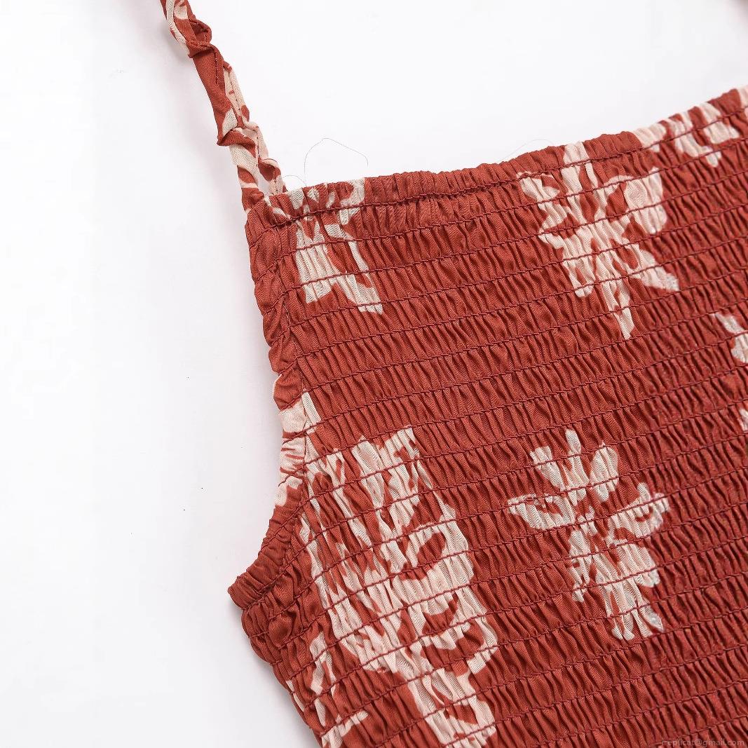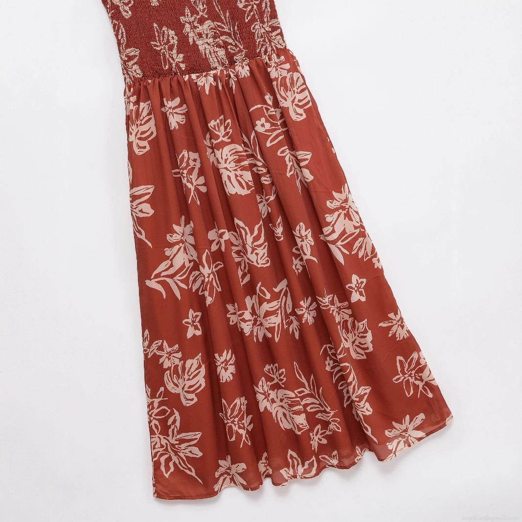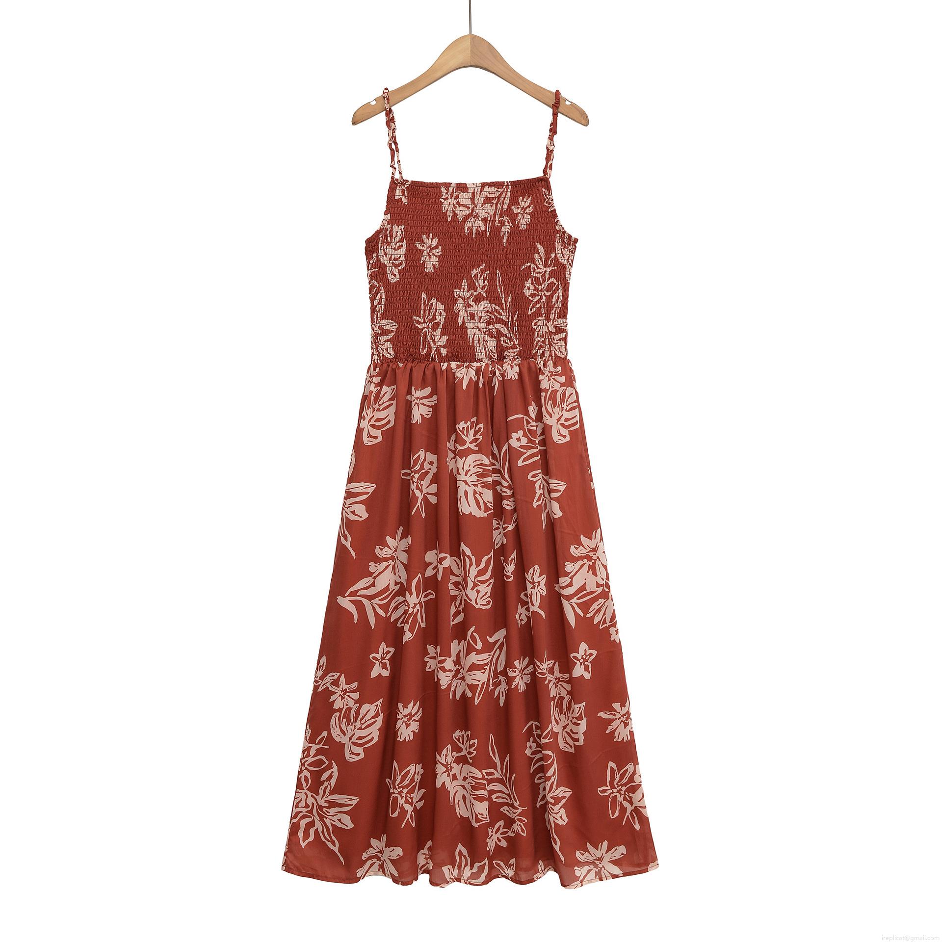 • Summer Women's Floral Print Smocked Cami Maxi Dress Sleeveless Spaghetti Strap Slim Fit Terracotta Beach Vacation Sundress For Women