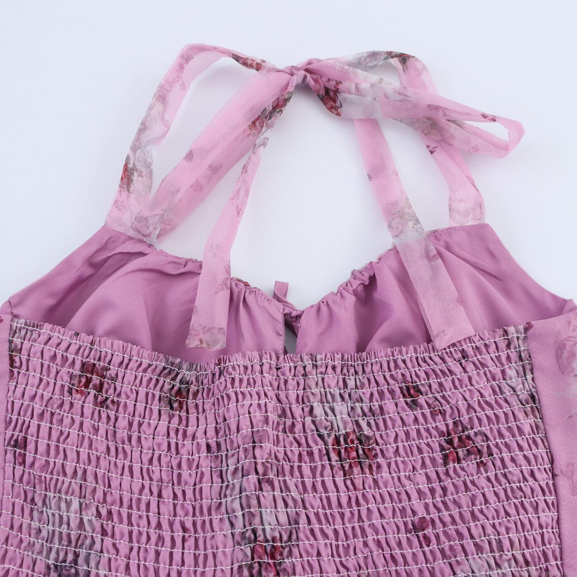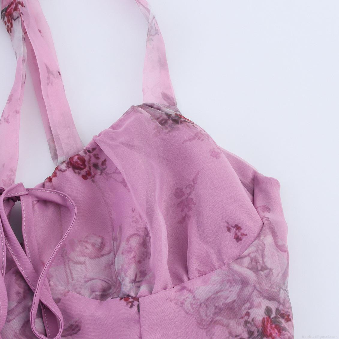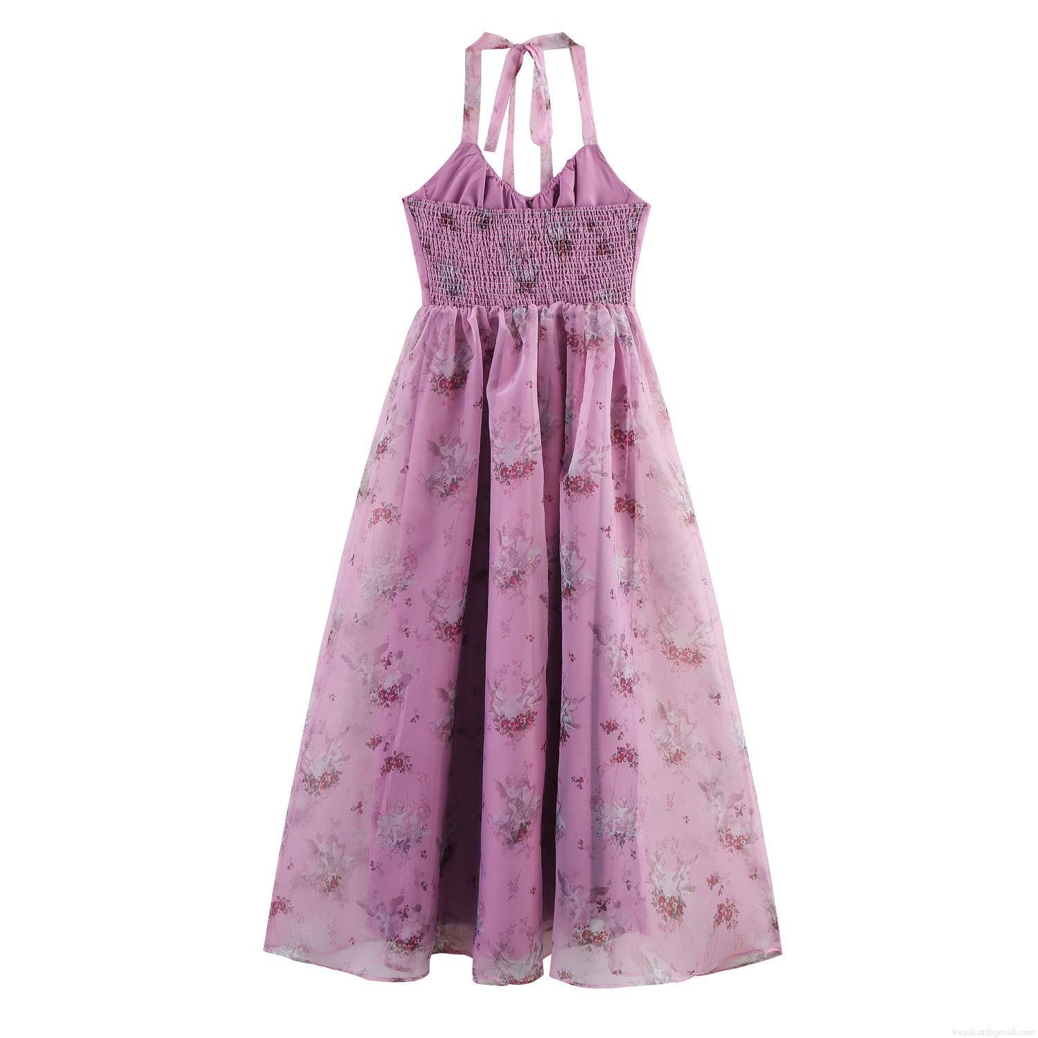 • Sweet Girl Style Floral Angel Print Organza Halter Maxi Dress With Shirred Back High Waist Elegant Polyester Chiffon Summer Sundress For Women