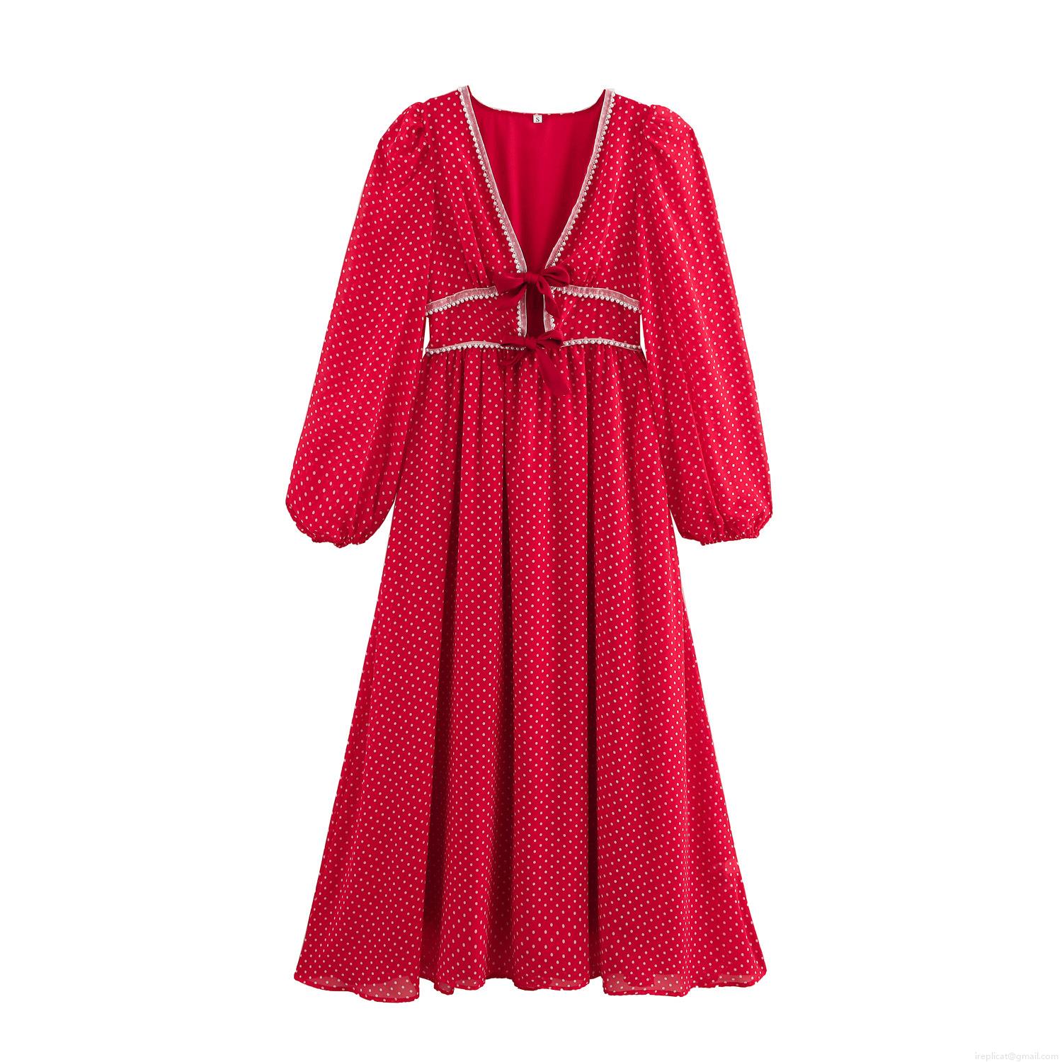Sweet Polka Dot V Neck Long Sleeve Dress With Bow Tie And Pearl Trim Red Chiffon A-Line Maxi Dress For Women Party Daily Wear