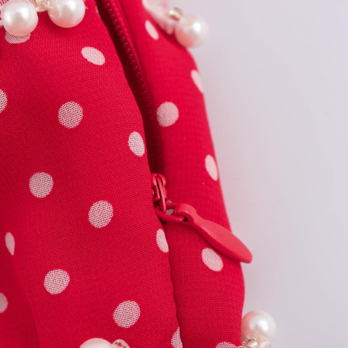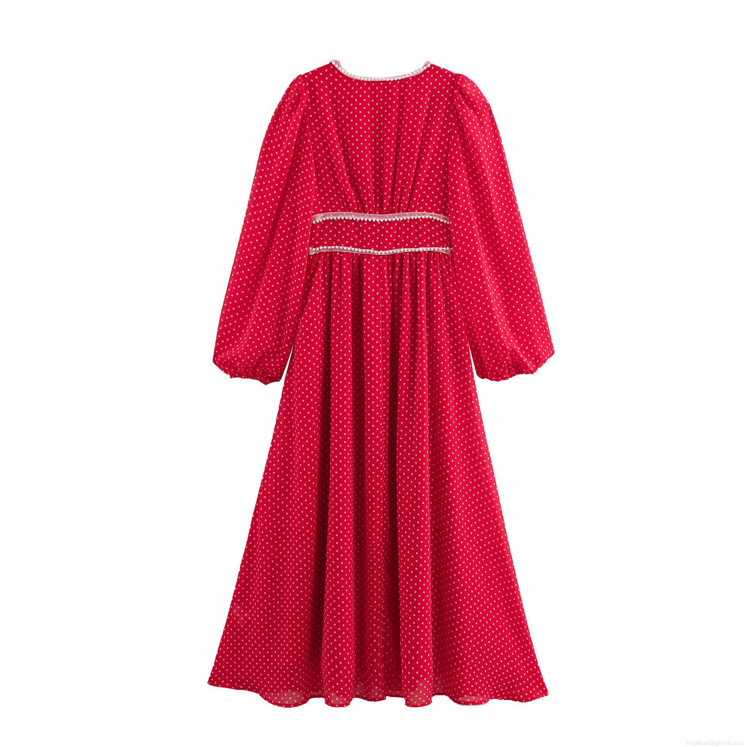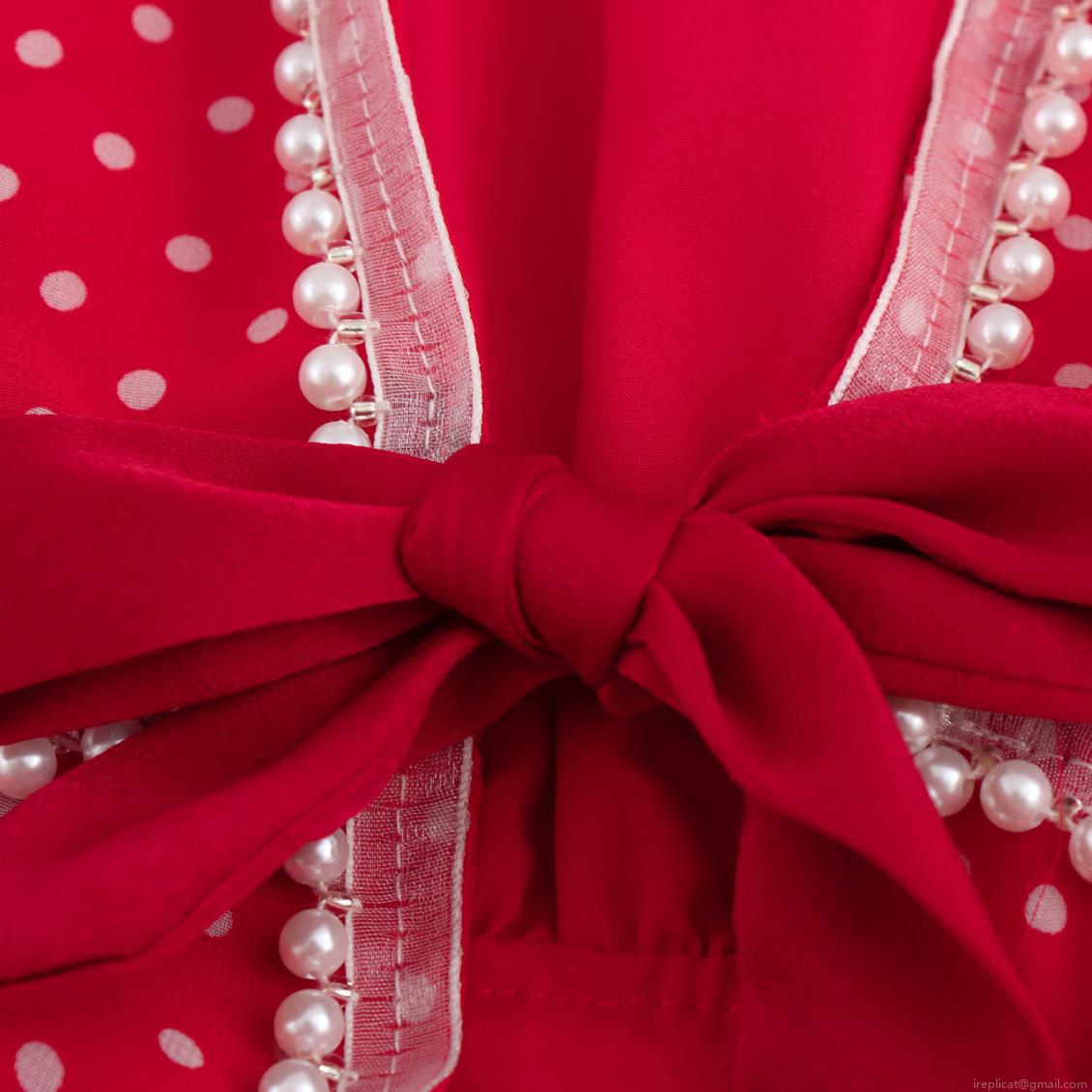 • Sweet Polka Dot V Neck Long Sleeve Dress With Bow Tie And Pearl Trim Red Chiffon A-Line Maxi Dress For Women Party Daily Wear