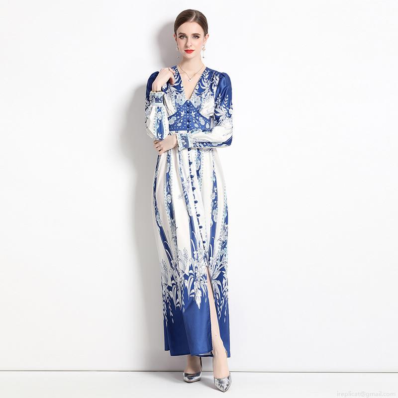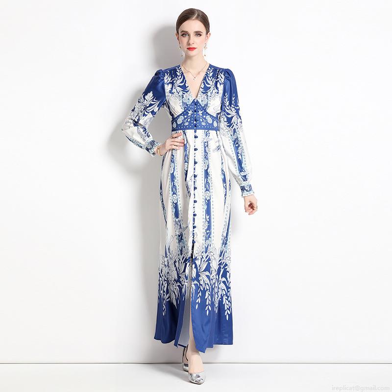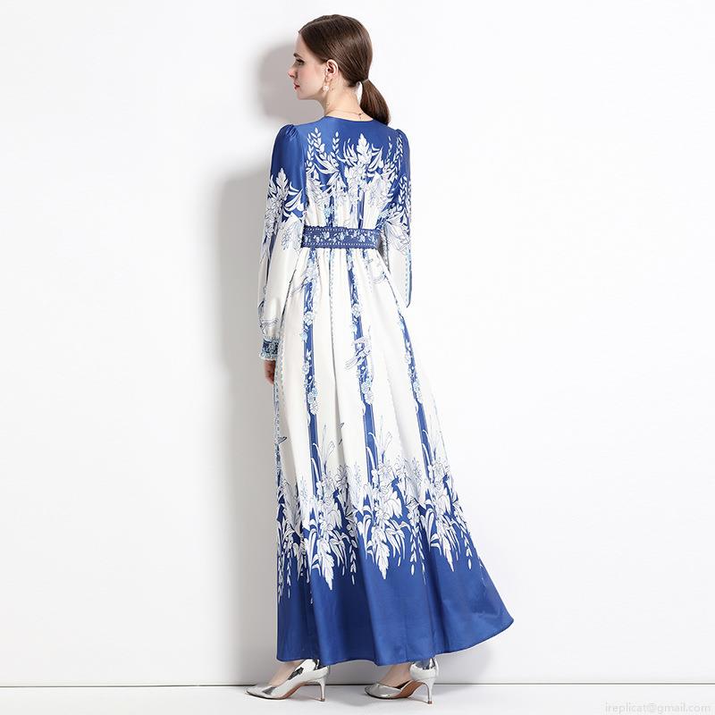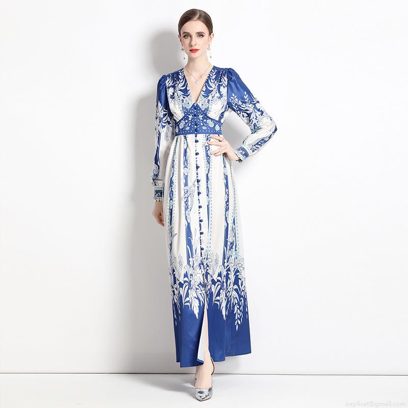 • Vintage Blue and White Floral Print Maxi Dress Elegant V-Neck Long Sleeve Satin Finish A-Line Long Dress for Women Party Vacation Bohemian Style Polyester Gown