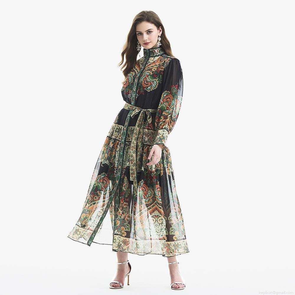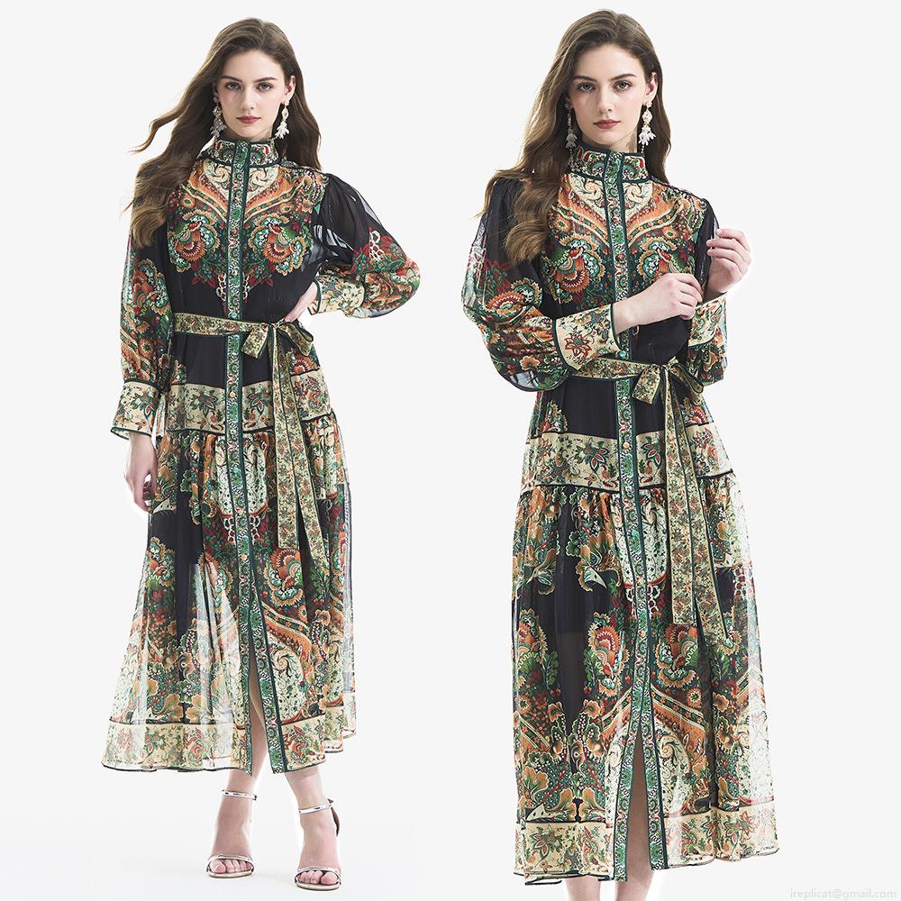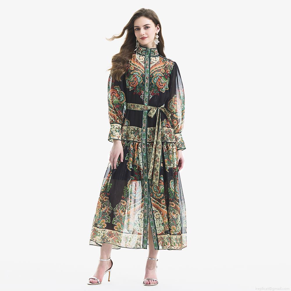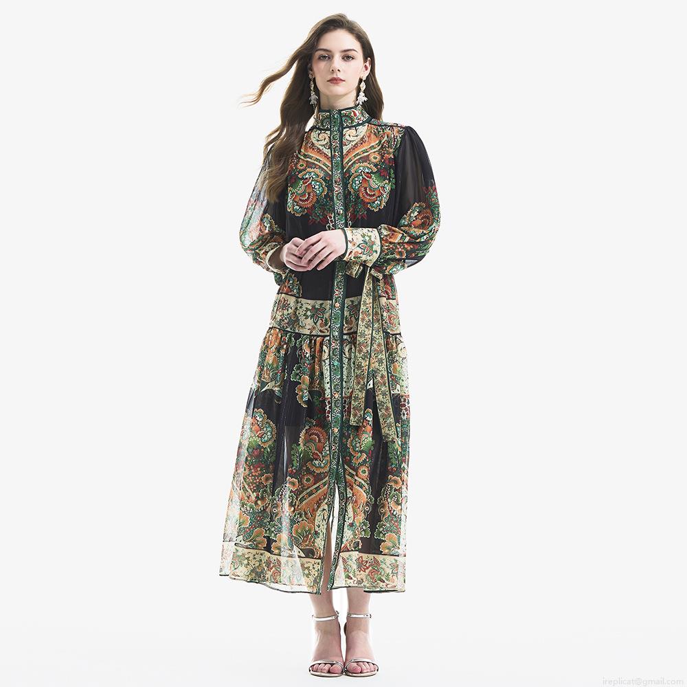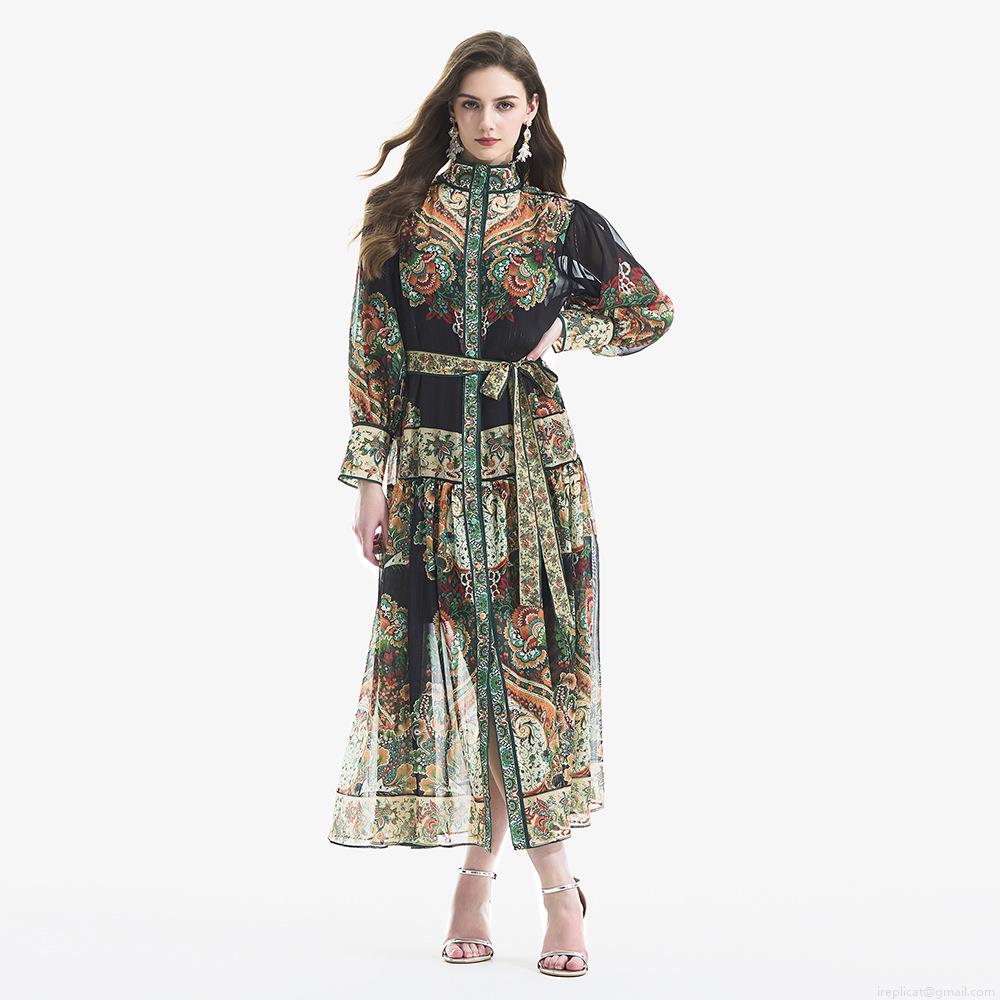 • Vintage Bohemian Paisley Print Maxi Dress For Women Lantern Sleeve Stand Collar Ruffle Hem High Waist Retro Ethnic Style Long Dress With Belt