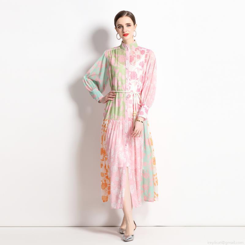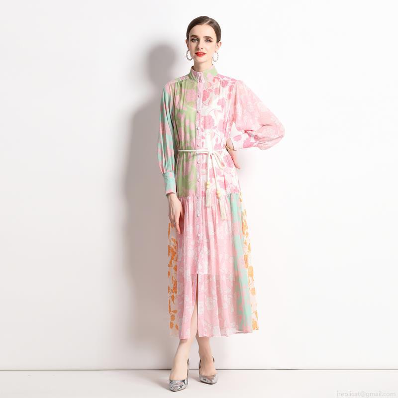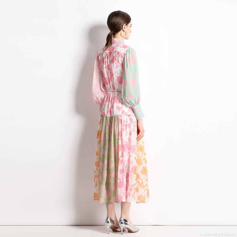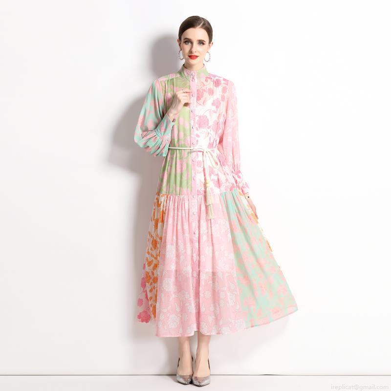 • Vintage Ethnic Patchwork Floral Print Maxi Dress For Women Elegant Stand Collar Lantern Sleeve Chiffon Feel Dress With Tassel Belt For Vacation Party