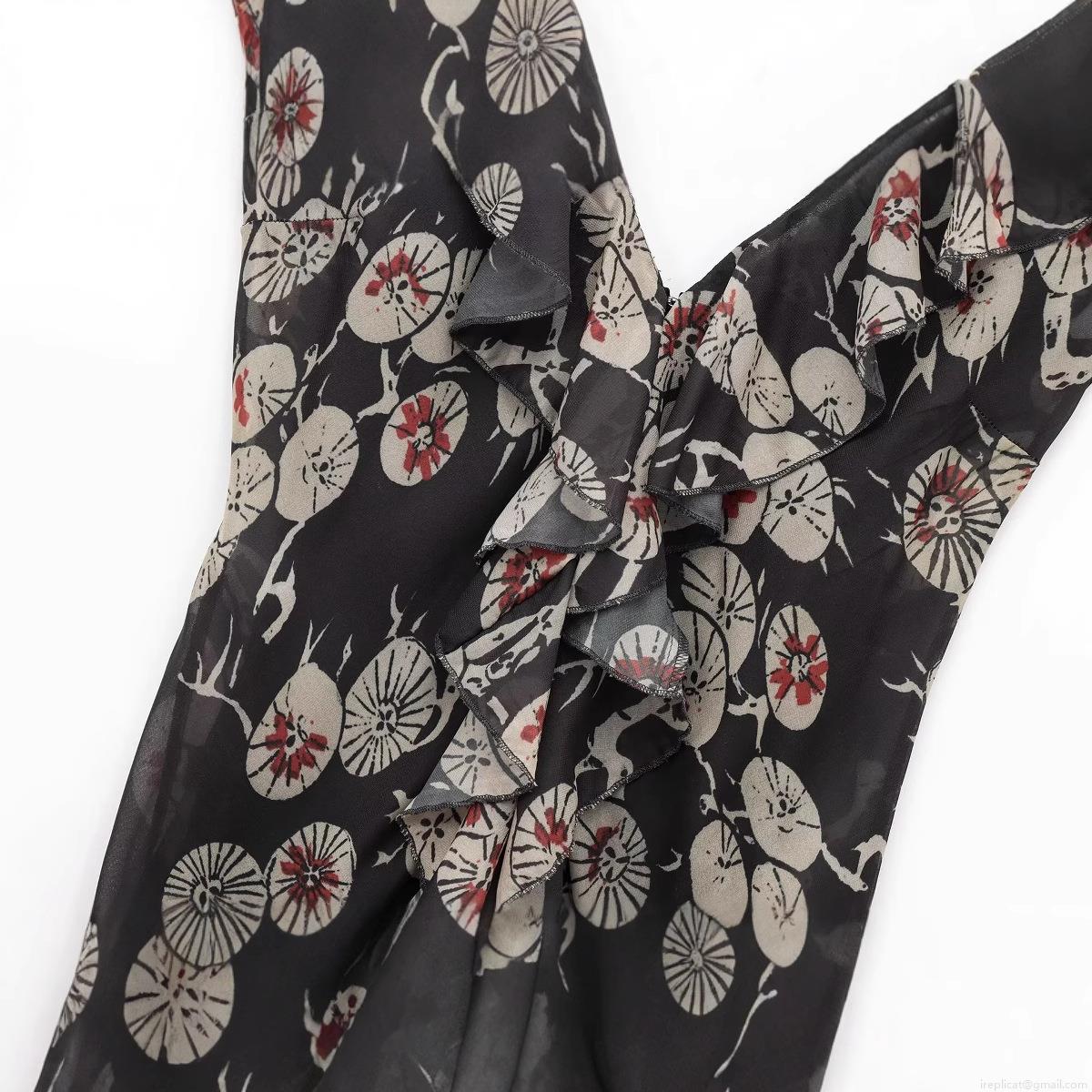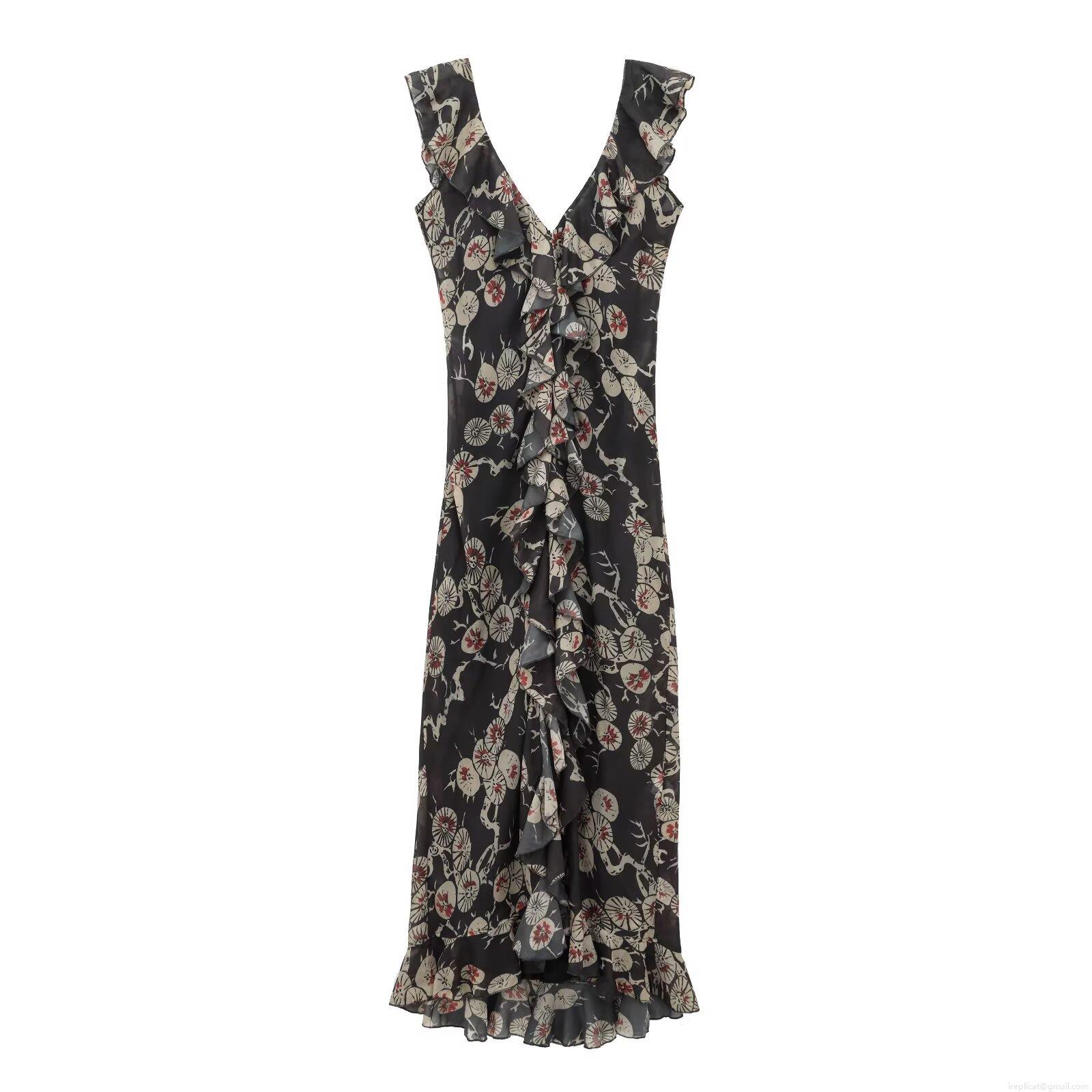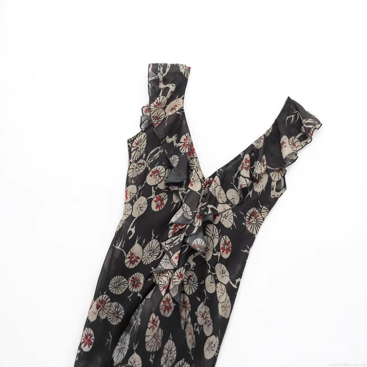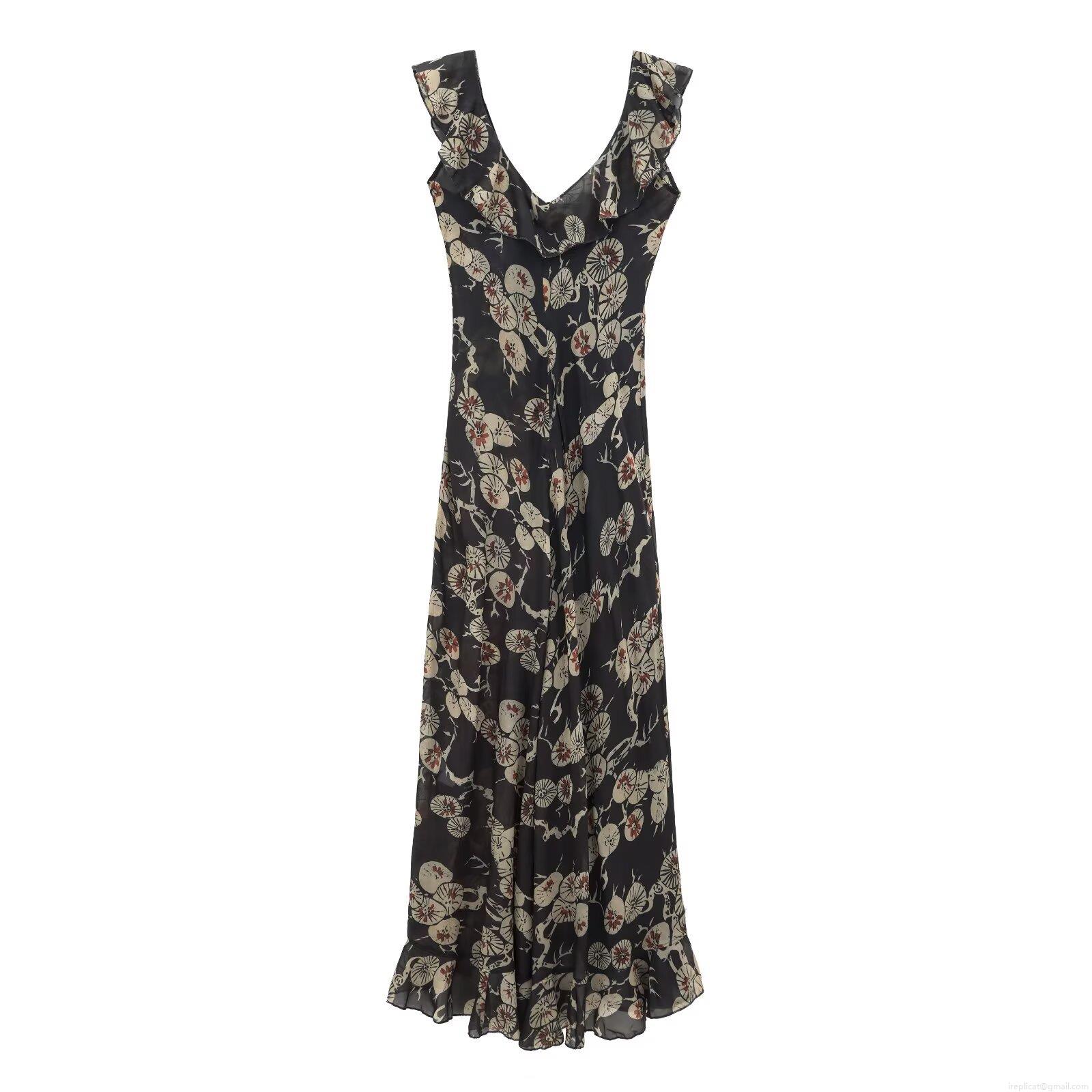 • Vintage Floral Print V-Neck Ruffle Sleeveless Maxi Dress With Sexy Slit Elegant Chiffon Long Dress For Women Summer Beach Party