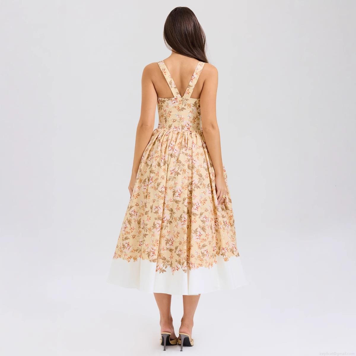 Floral Pattern, Waist shaping, Single-breasted, Floral Print, Square Collar, White Patchwork Skirt, Wide Shoulder Strap