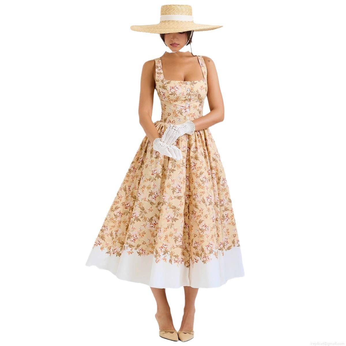 Vintage French Floral Maxi Dress For Women Square Neck Button Front Sleeveless A-Line Long Dress Sexy Summer Vacation Patchwork Hem Sundress