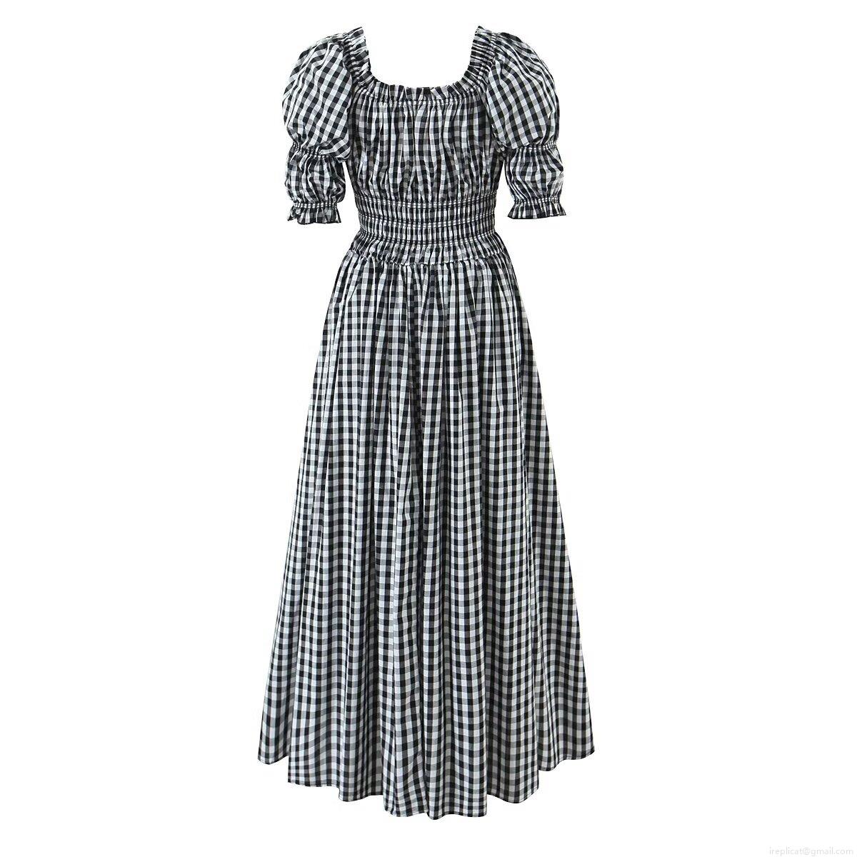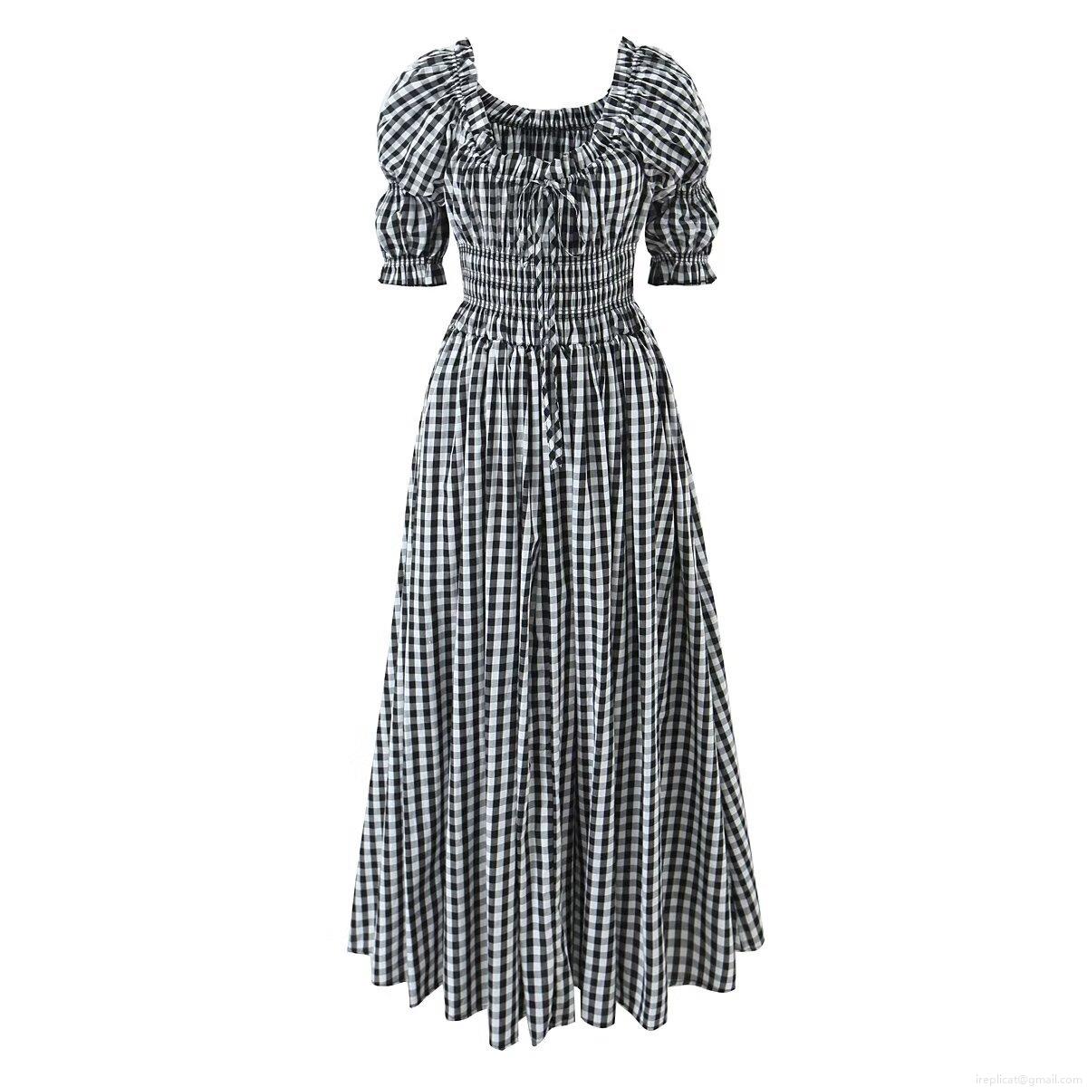 • Vintage Gingham Cotton Maxi Dress For Women Square Neck Short Puff Sleeve Smocked Waist A-Line Long Dress Retro Plaid Summer Vacation Party Dress