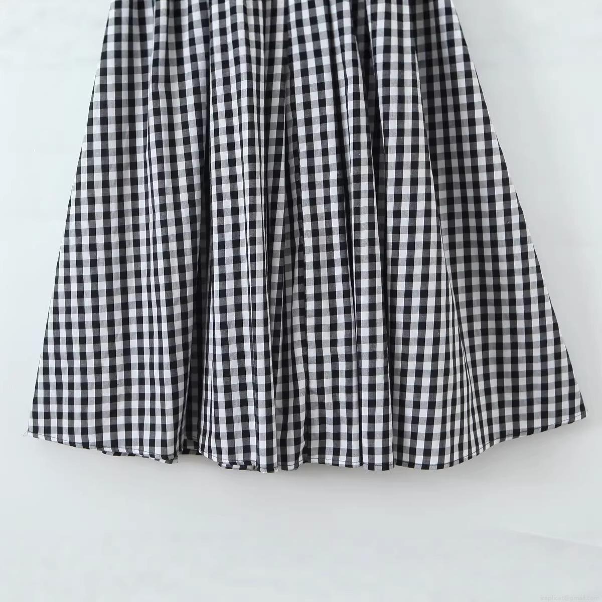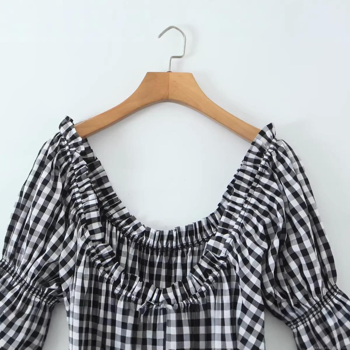 Checkered Pattern, Ruffles, Lace, Puff Sleeves, Square Collar, Gathered Waist