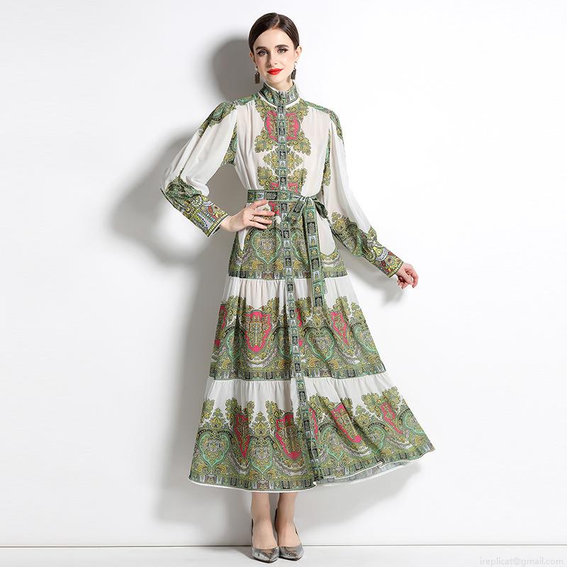 • Vintage Paisley Print Chiffon Maxi Dress For Women Elegant Stand Collar Single Breasted Lantern Sleeve Large Swing Dress With Belt Spring Summer Fashion