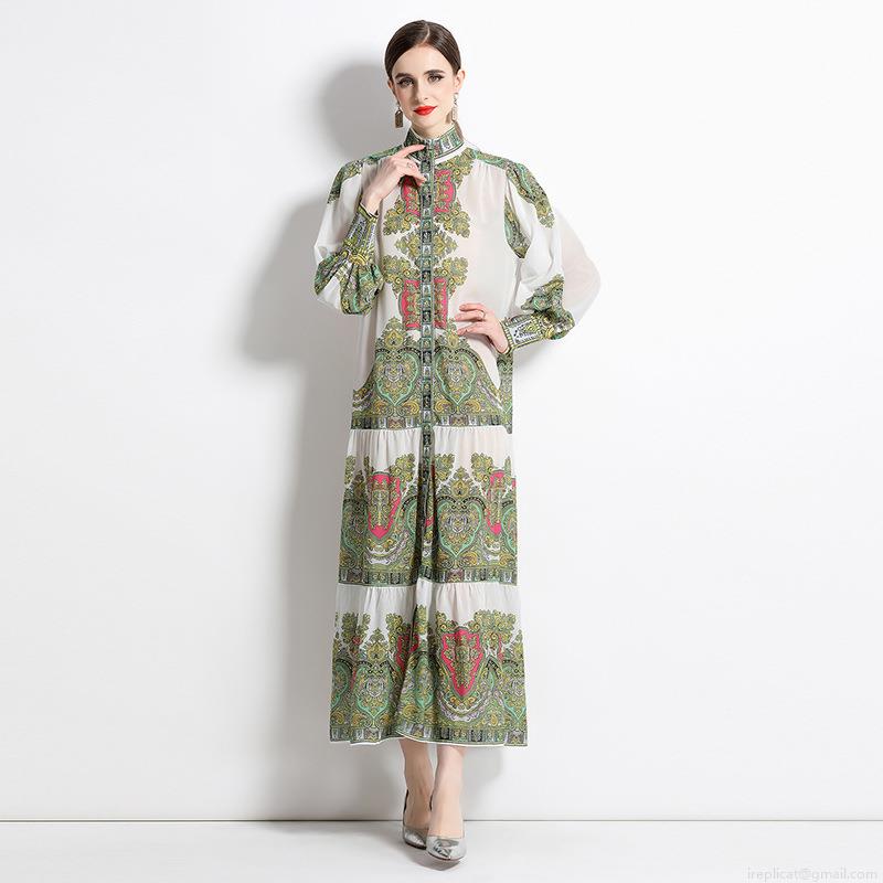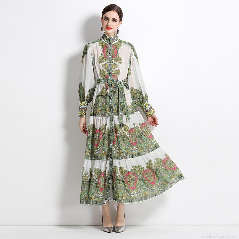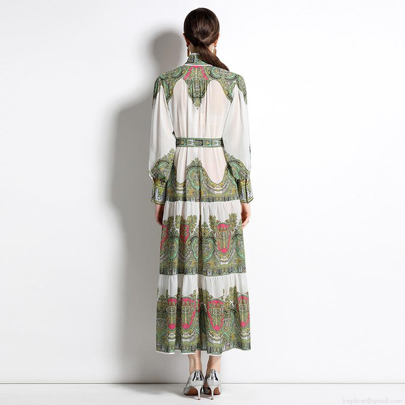 Vintage Paisley Print Chiffon Maxi Dress For Women Elegant Stand Collar Single Breasted Lantern Sleeve Large Swing Dress With Belt Spring Summer Fashion