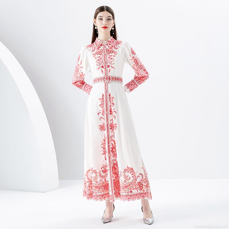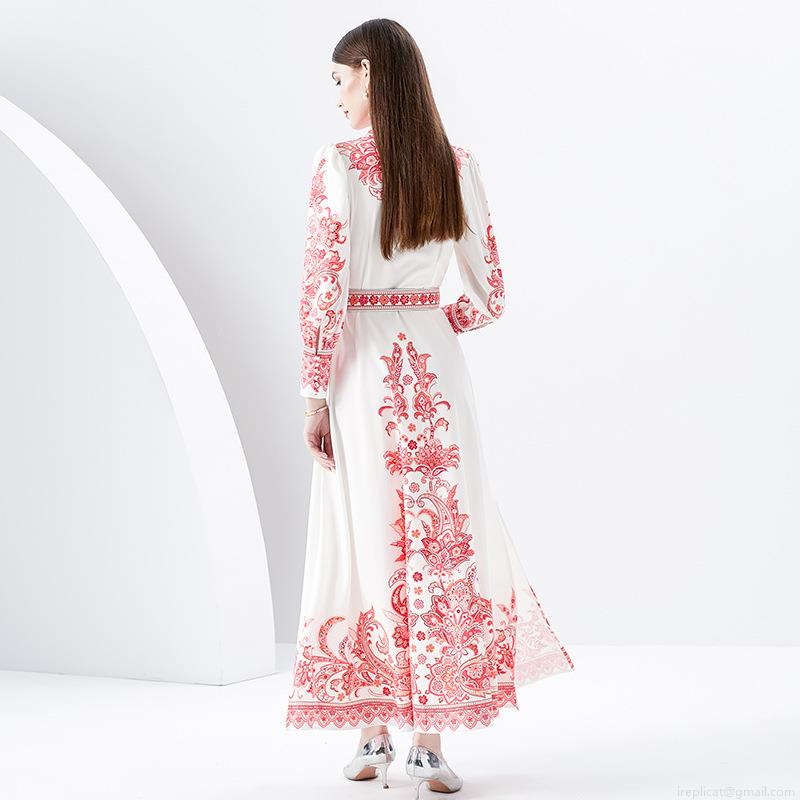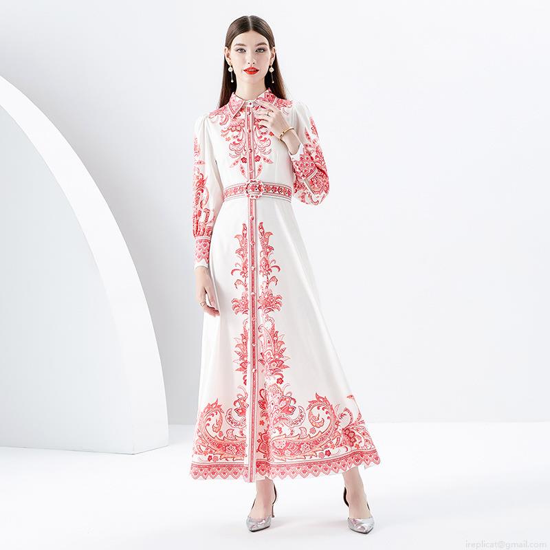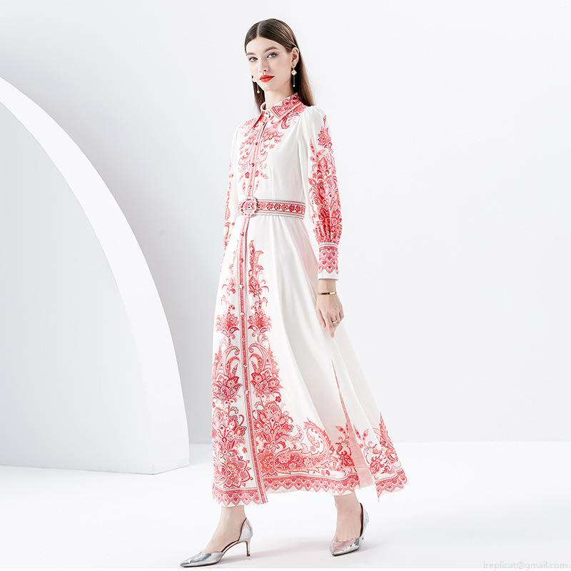 • Vintage Palace Style Red Paisley Print Maxi Dress For Women Elegant White Lapel Lantern Sleeve Single Breasted Long Dress With Belt And Side Slit For Vacation