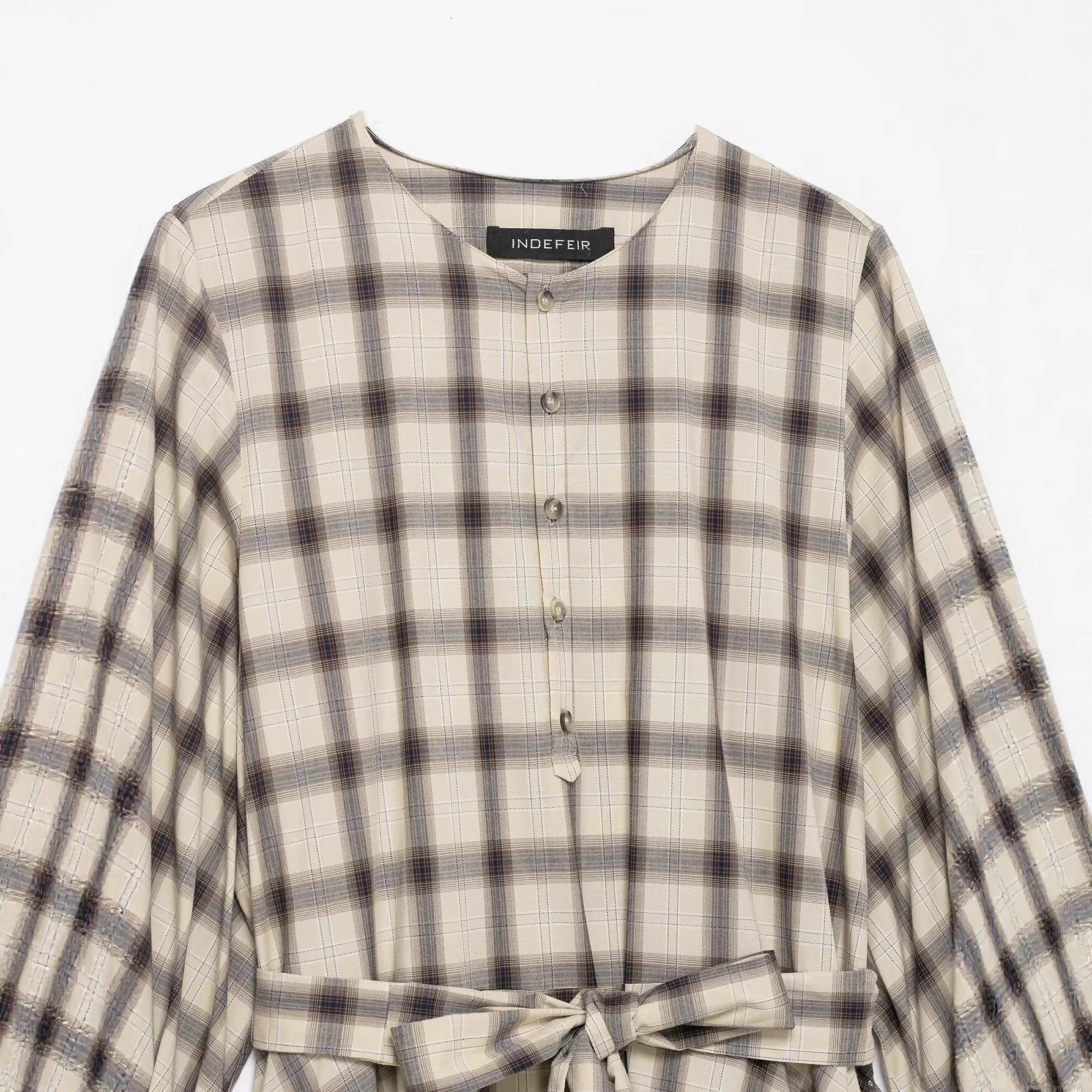 • Vintage Plaid Lantern Sleeve Shirt Dress For Women Elegant Belted Long Maxi Dress Autumn Winter Button Up Office Lady Vestidos