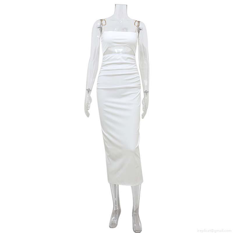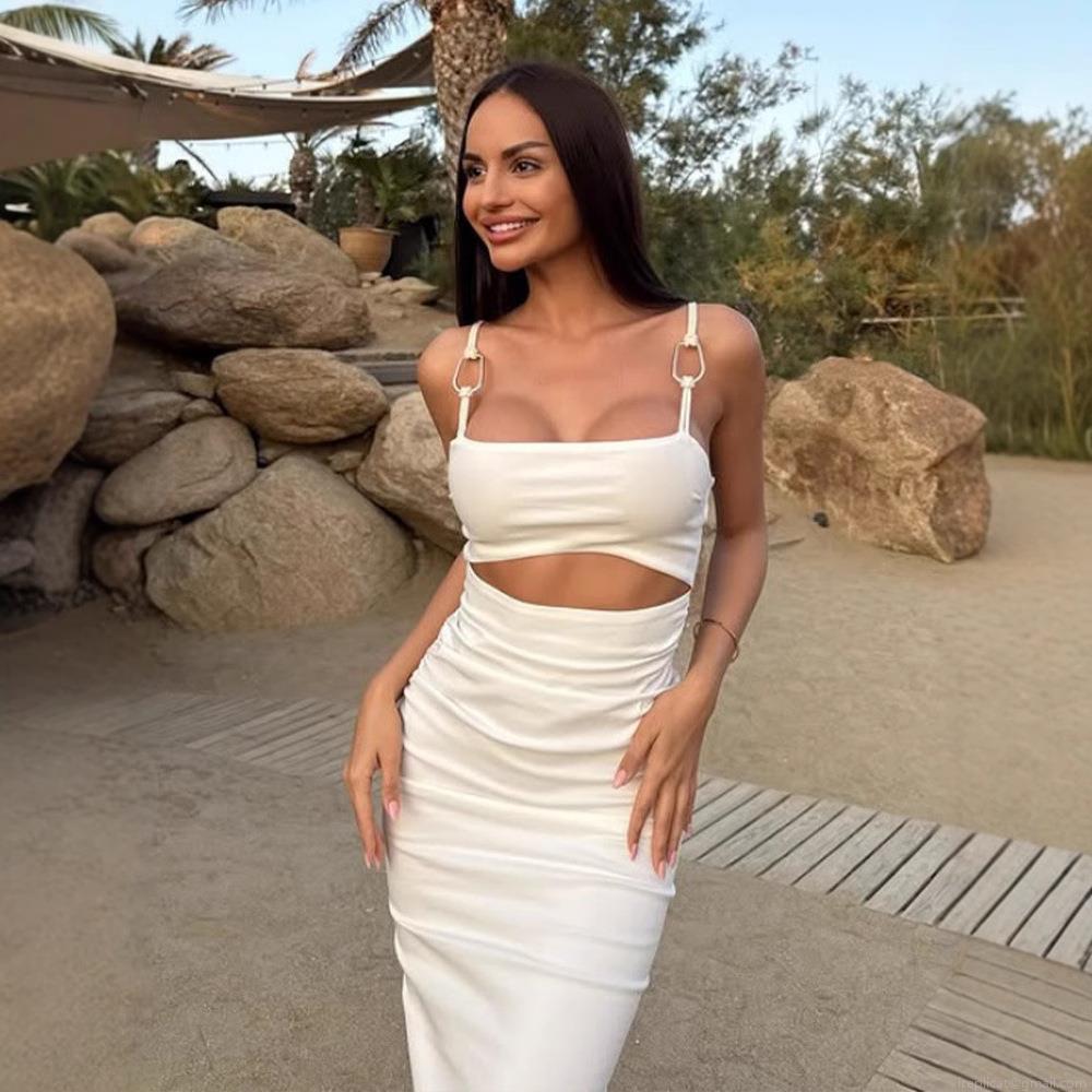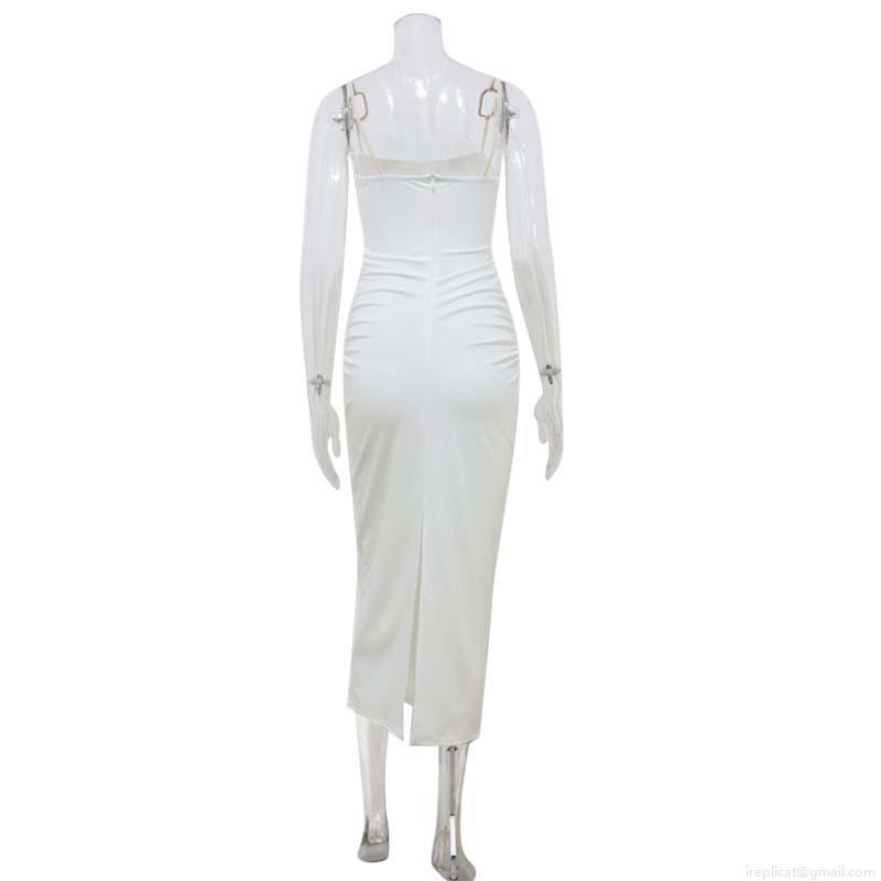 • White Backless Halter Maxi Dress With Metal Rings Sexy Hollow Out Ruched Bodycon Long Dress For Women Summer Resort Party Elegant Evening Gown