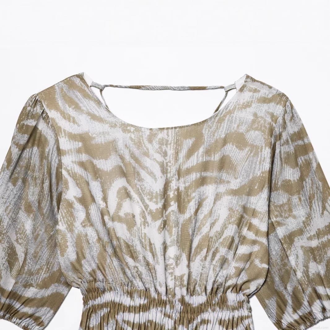Zebra, Hollow Out, Drawstring, Tiger Stripes, Lace, Backless, Puff Sleeves, Abstract Animal Print