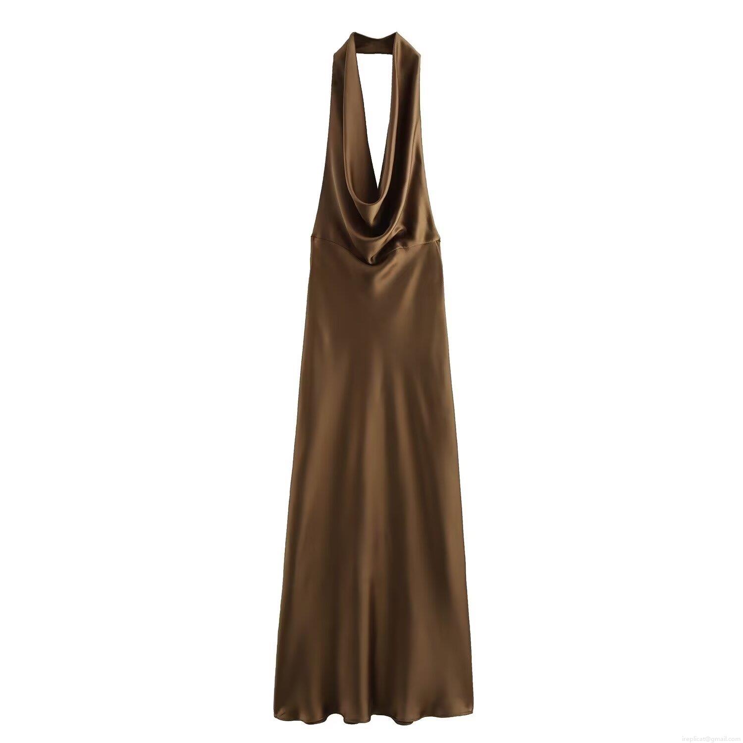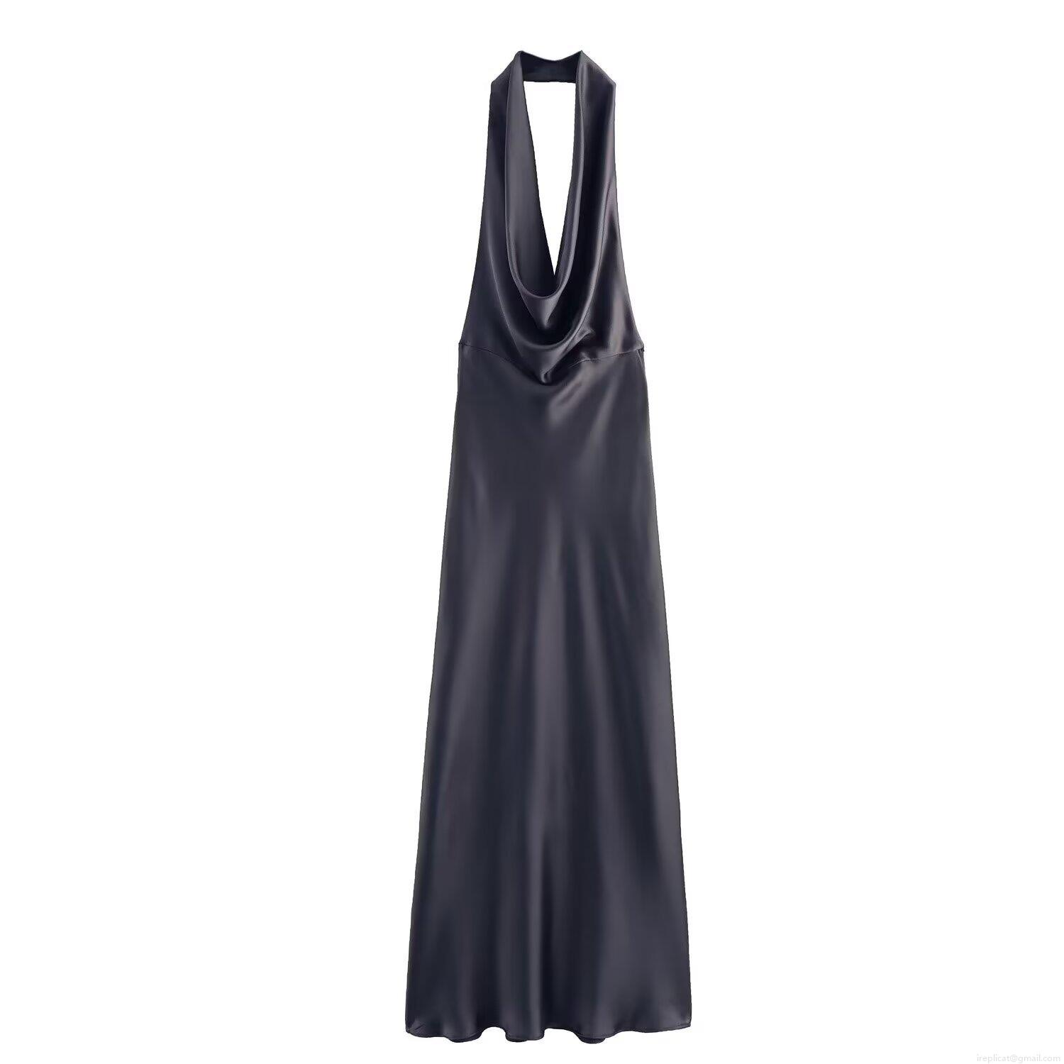 • Women Backless Halter Maxi Dress Elegant Satin Silk Cowl Neck Sleeveless Solid Color Evening Party Banquet Celebrity Style Long Dress