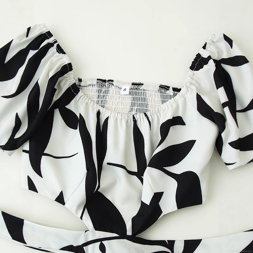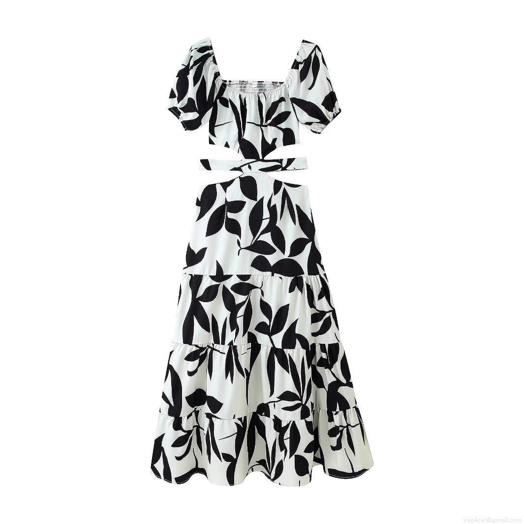 • Women Black and White Leaf Print Polyester Maxi Dress Square Neck Hollow Out Puff Sleeve Tiered Cake Dress Elegant Resort Summer Party Beach Sundress