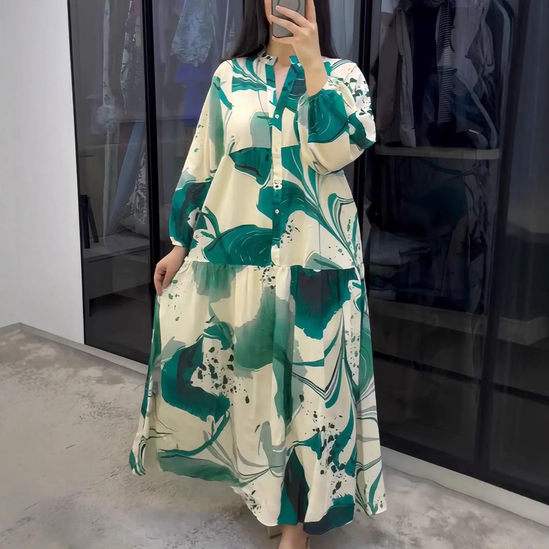 • Women Bohemian Abstract Print V Neck Long Sleeve Button Front Loose Fit Maxi Dress Lightweight Polyester Spandex Vacation Casual Elegant A Line Dress