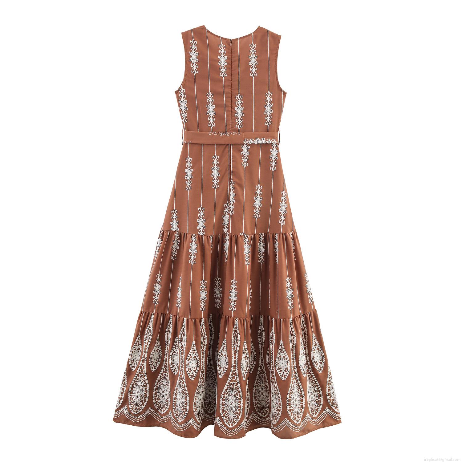 • Women Bohemian Embroidered Maxi Dress Sleeveless V-Neck Waist Tie Long Dress Vintage Ethnic Style Summer Vacation Beach Dress