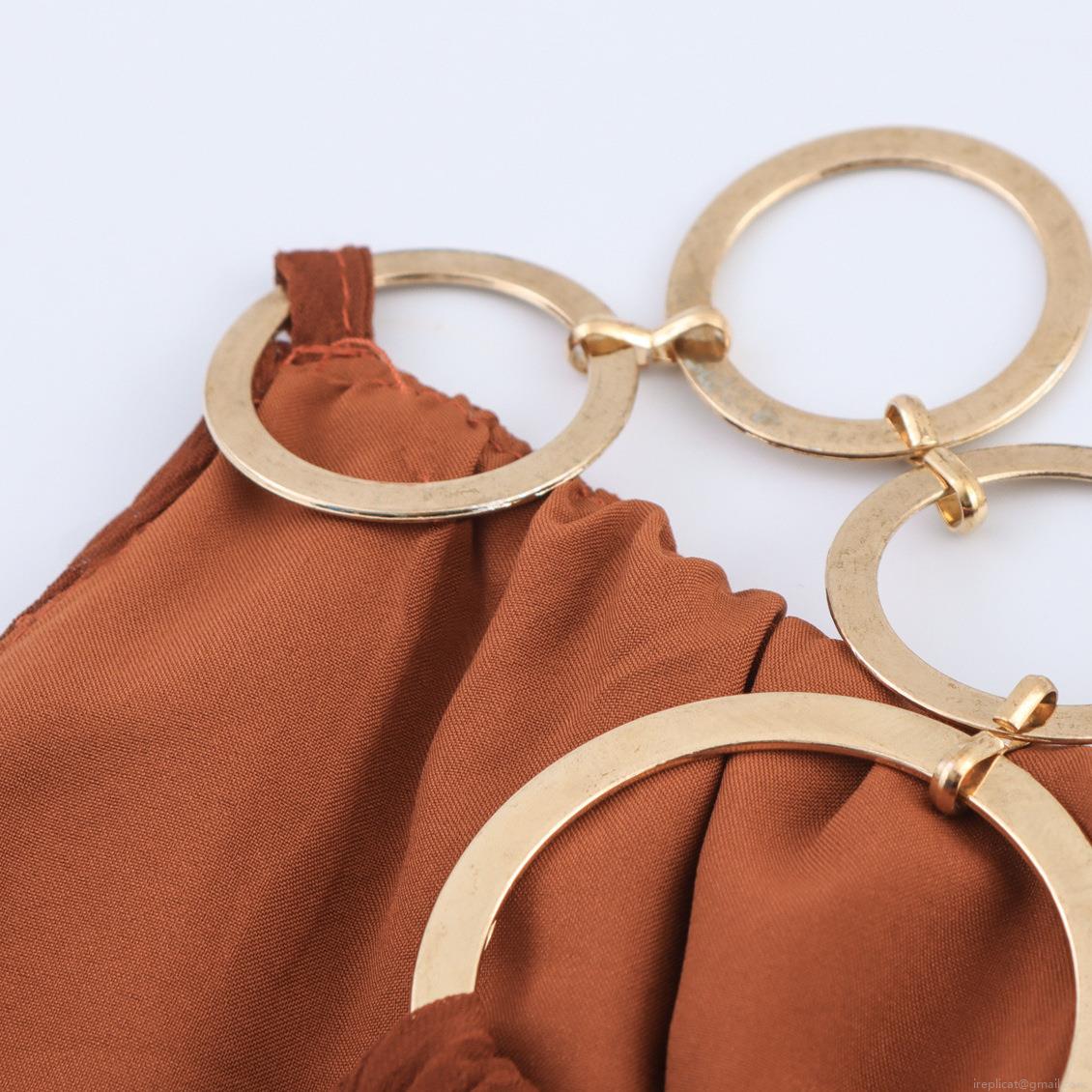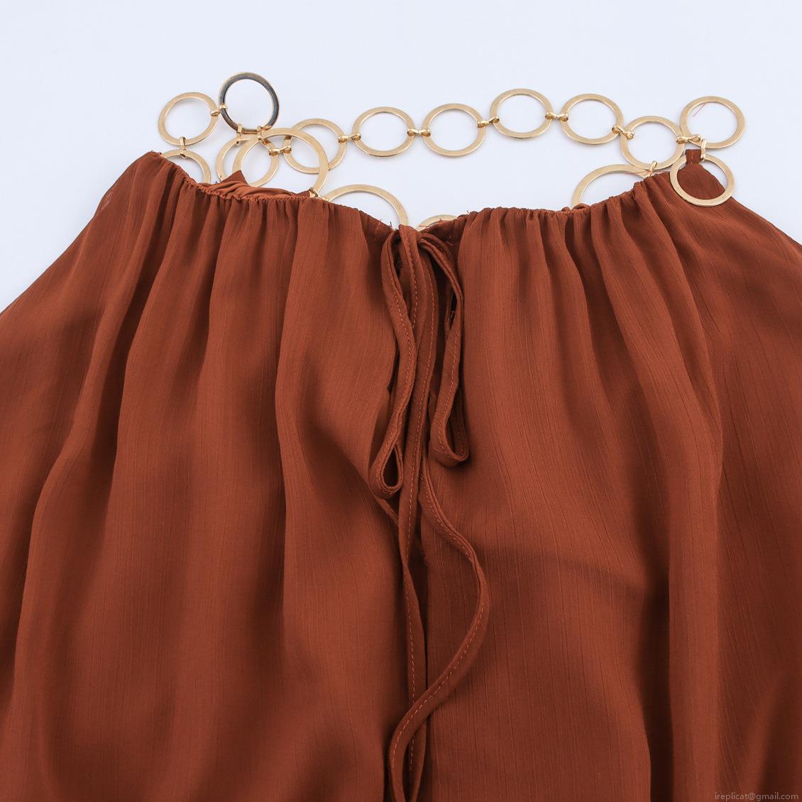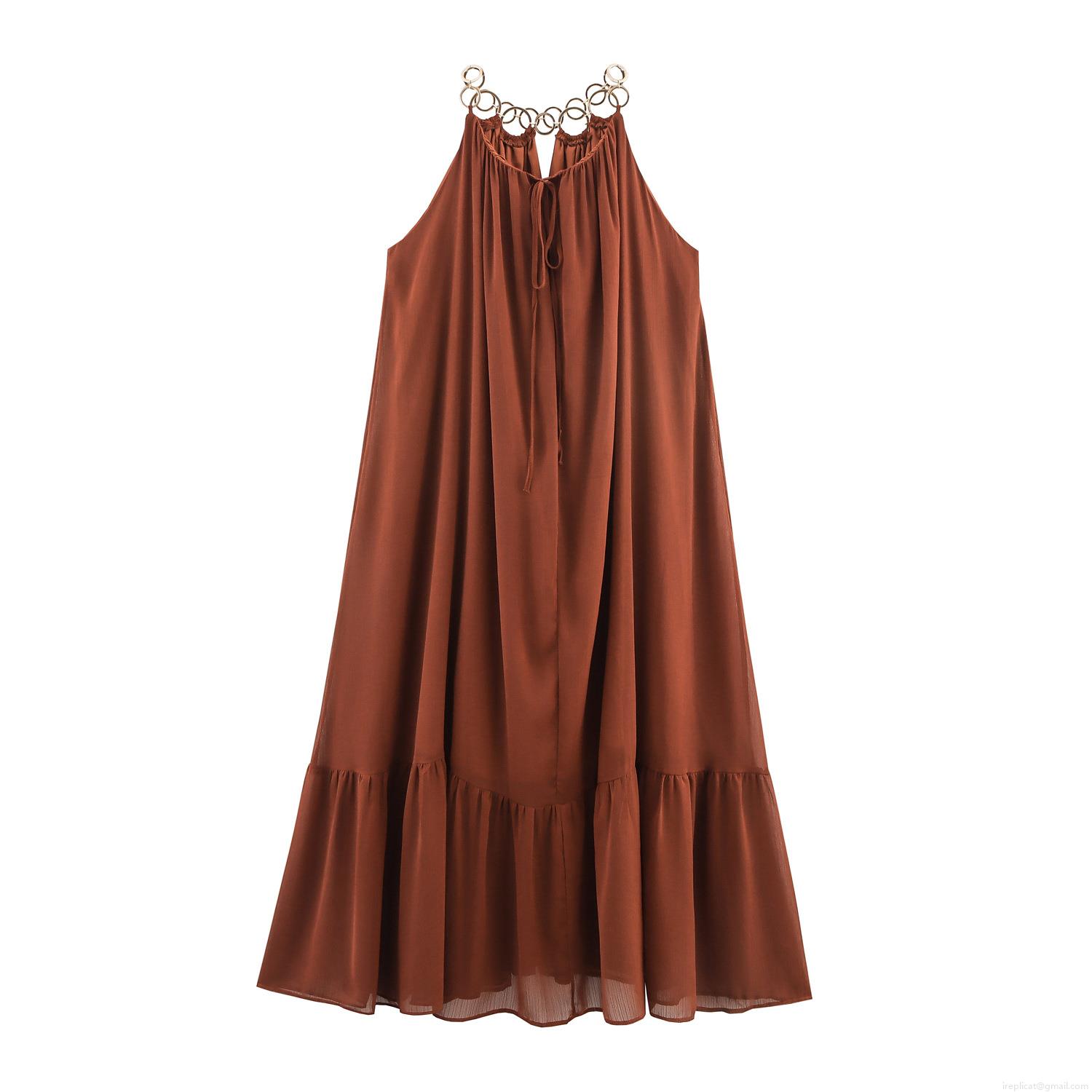 • Women Bohemian Halter Neck Maxi Dress With Gold Metal Ring Chain Ruffle Hem Sleeveless Solid Color Loose Chiffon Long Dress For Summer Vacation Party